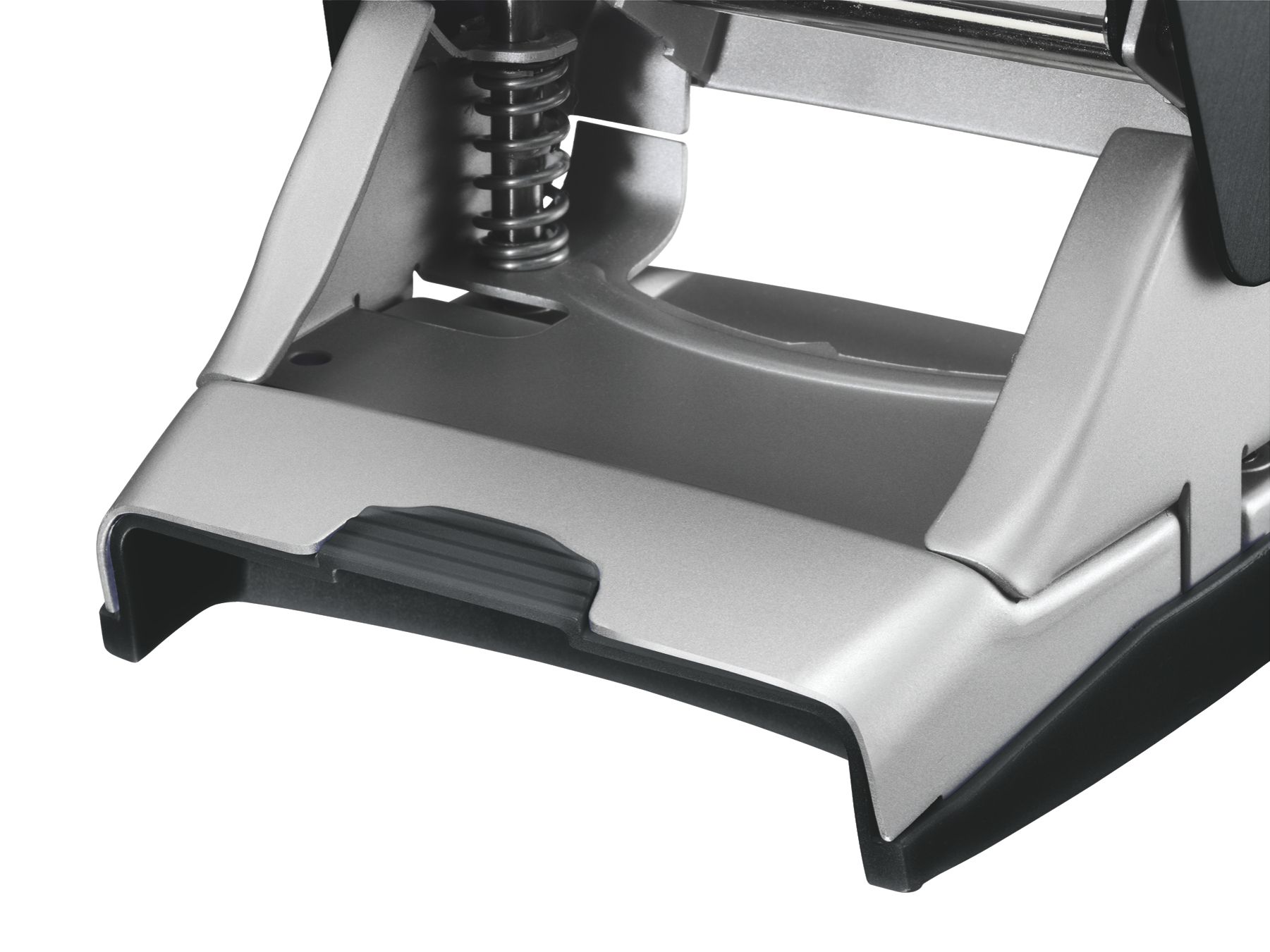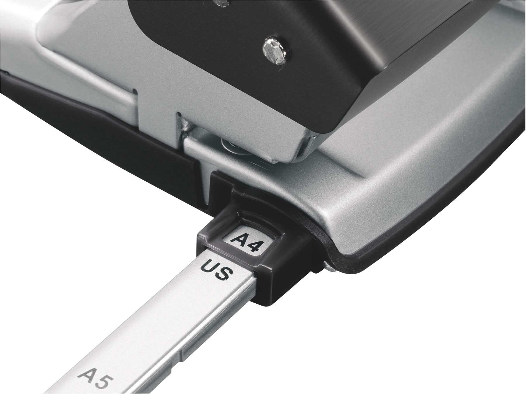 Opvallende metalen perforator voor dagelijks gebruik, met een modern geborsteld oppervlakdesign en een geraffineerd kleurenscala: poolwit, granaatrood, zeegroen, titaniumblauw en satijnzwart. Robuust en betrouwbaar. Gepatenteerde handgreep en extra scherpe stansen verminderen de benodigde drukkracht.