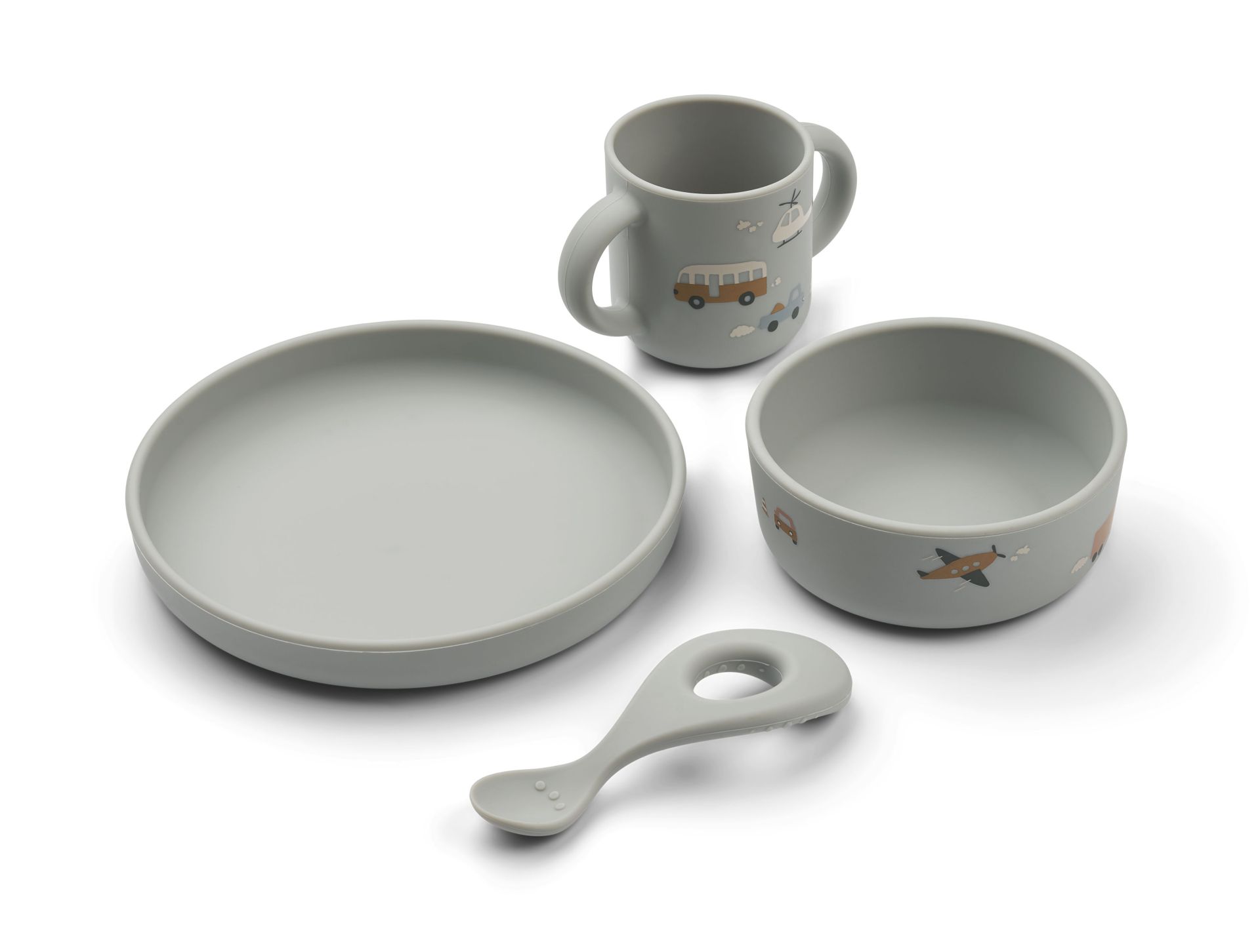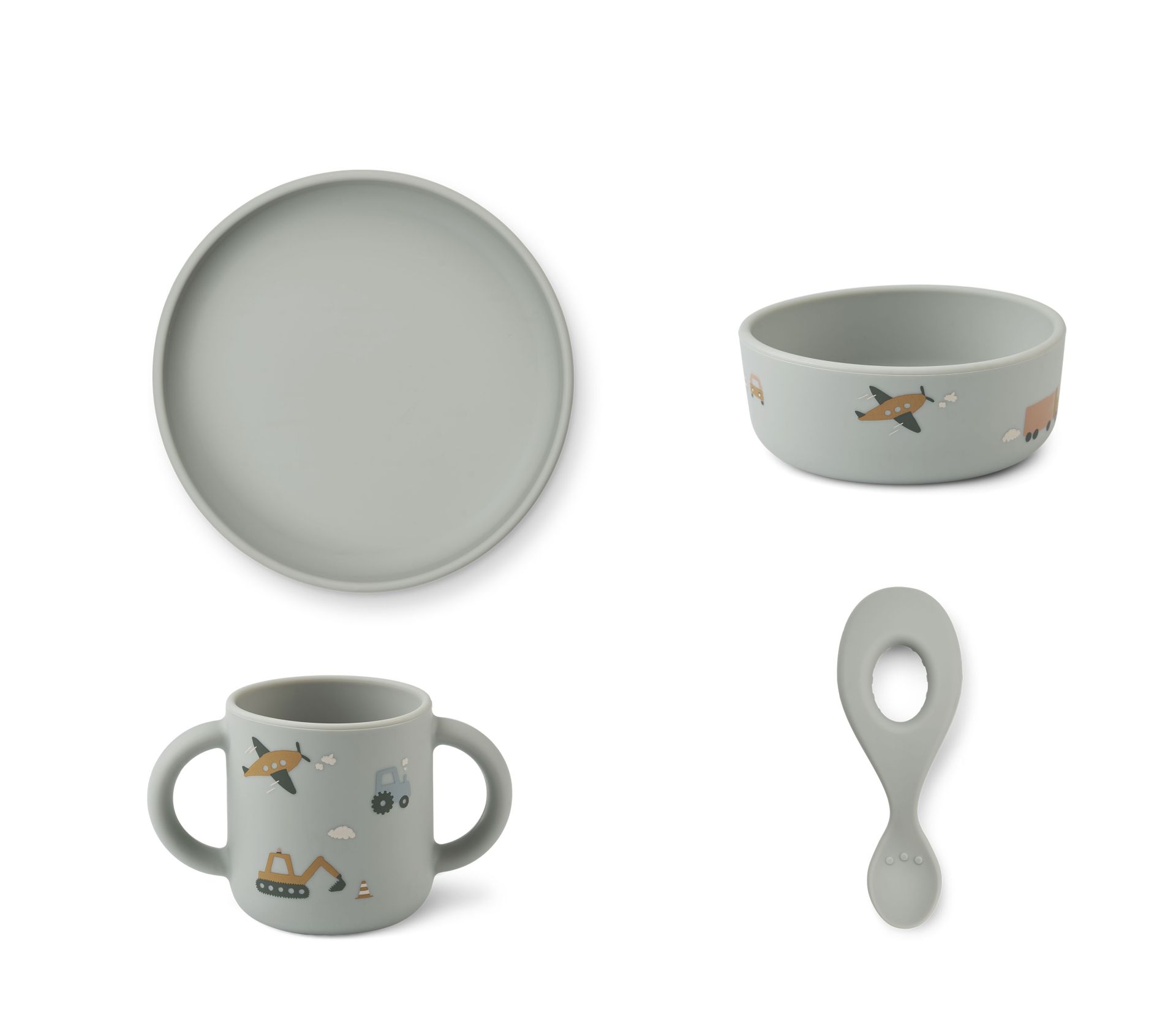 Liewood Eetset Vivi Vehicles Dove Blue Mix - Bord Bowl Mug Lepel