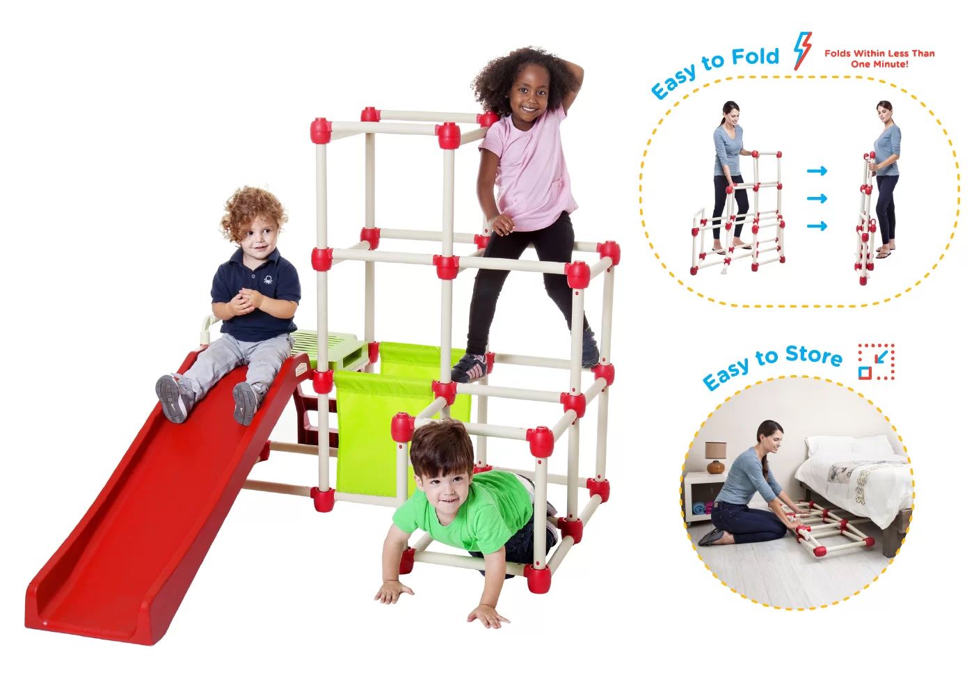 De Lil' Monkey Everest Climber GYM is een opvouwbare klimtoestel met een glijbaan, geschikt voor kinderen van 1,5 tot 5 jaar.