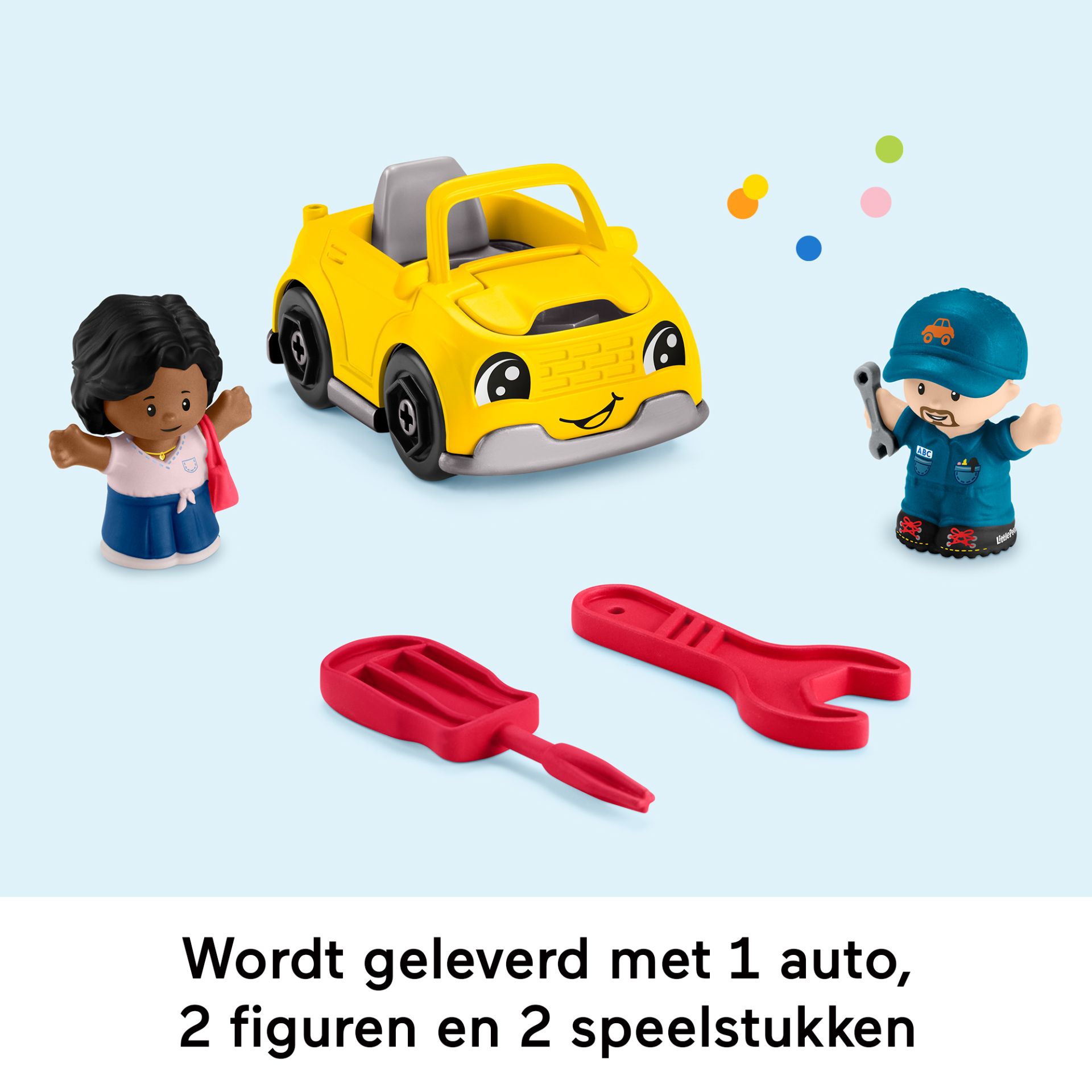 De speelset bevat 2 figuren, 2 speelonderdelen en een duwauto met een motorkap die open kan voor realistisch fantasiespel