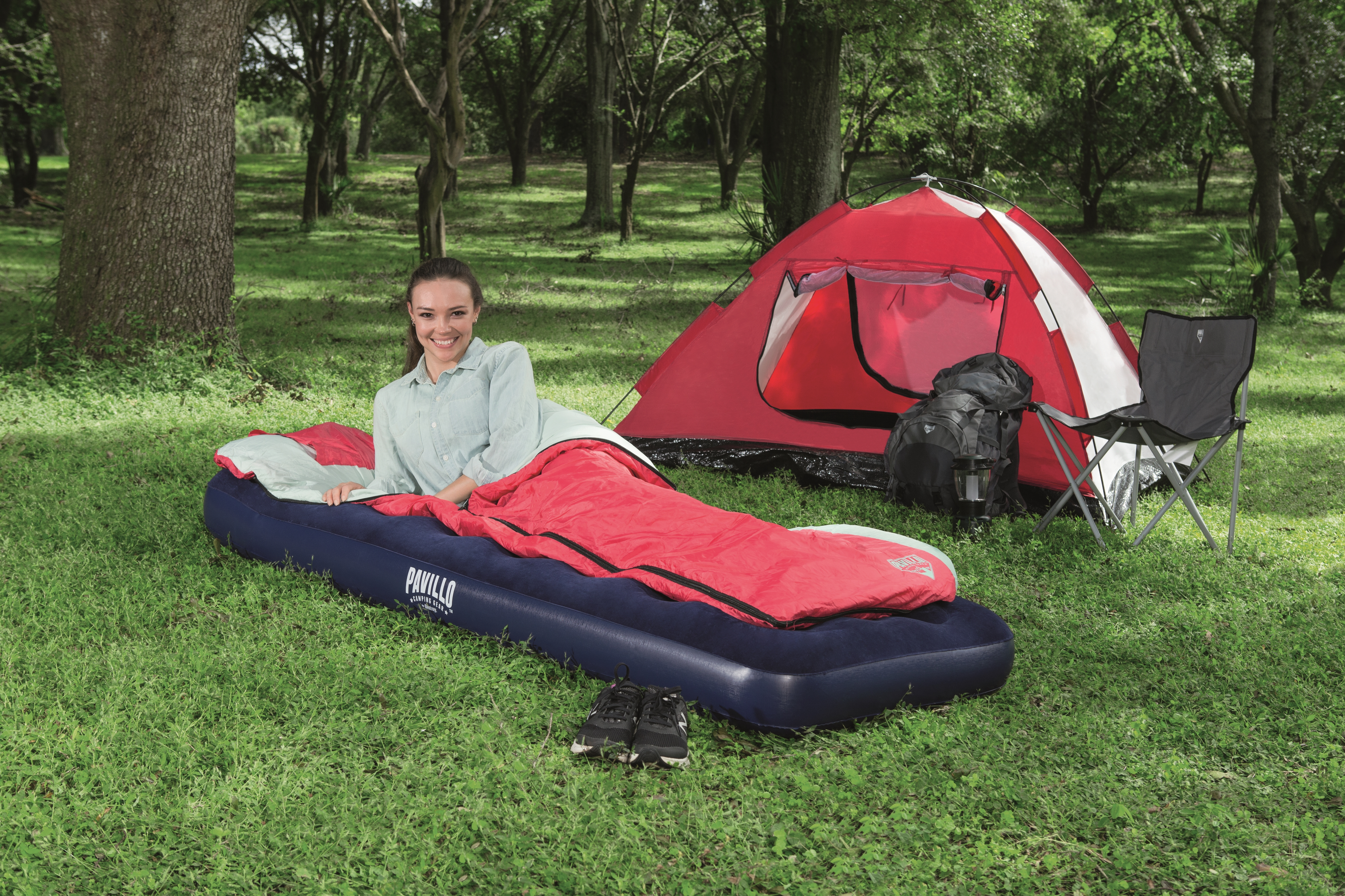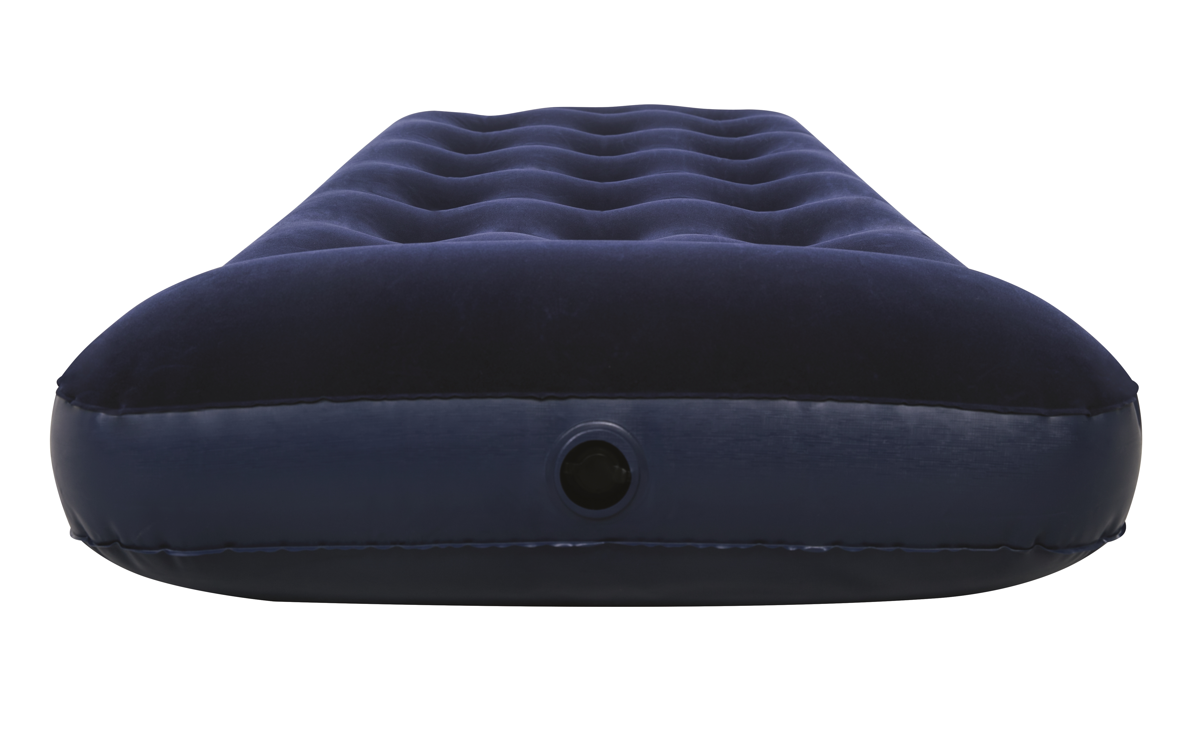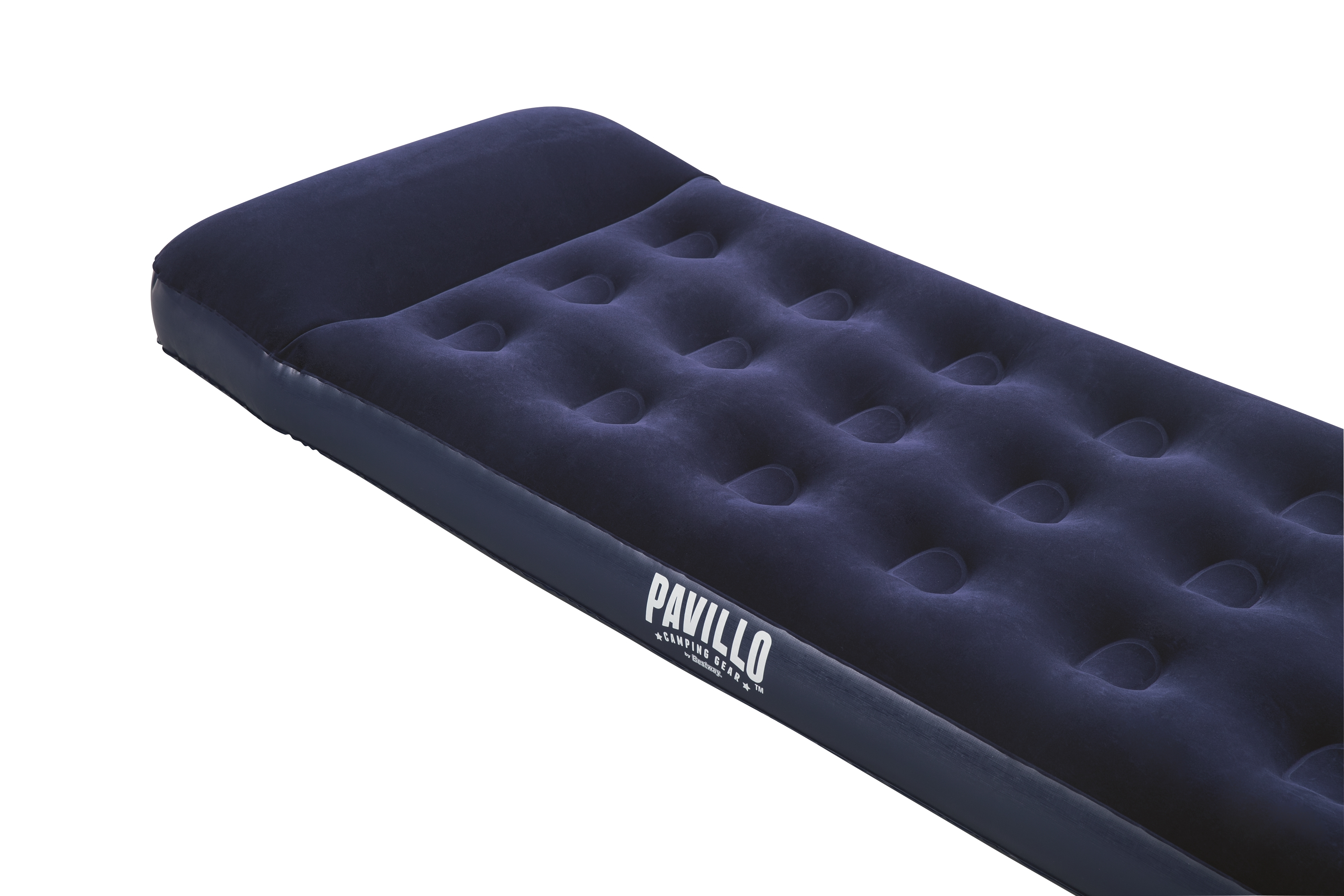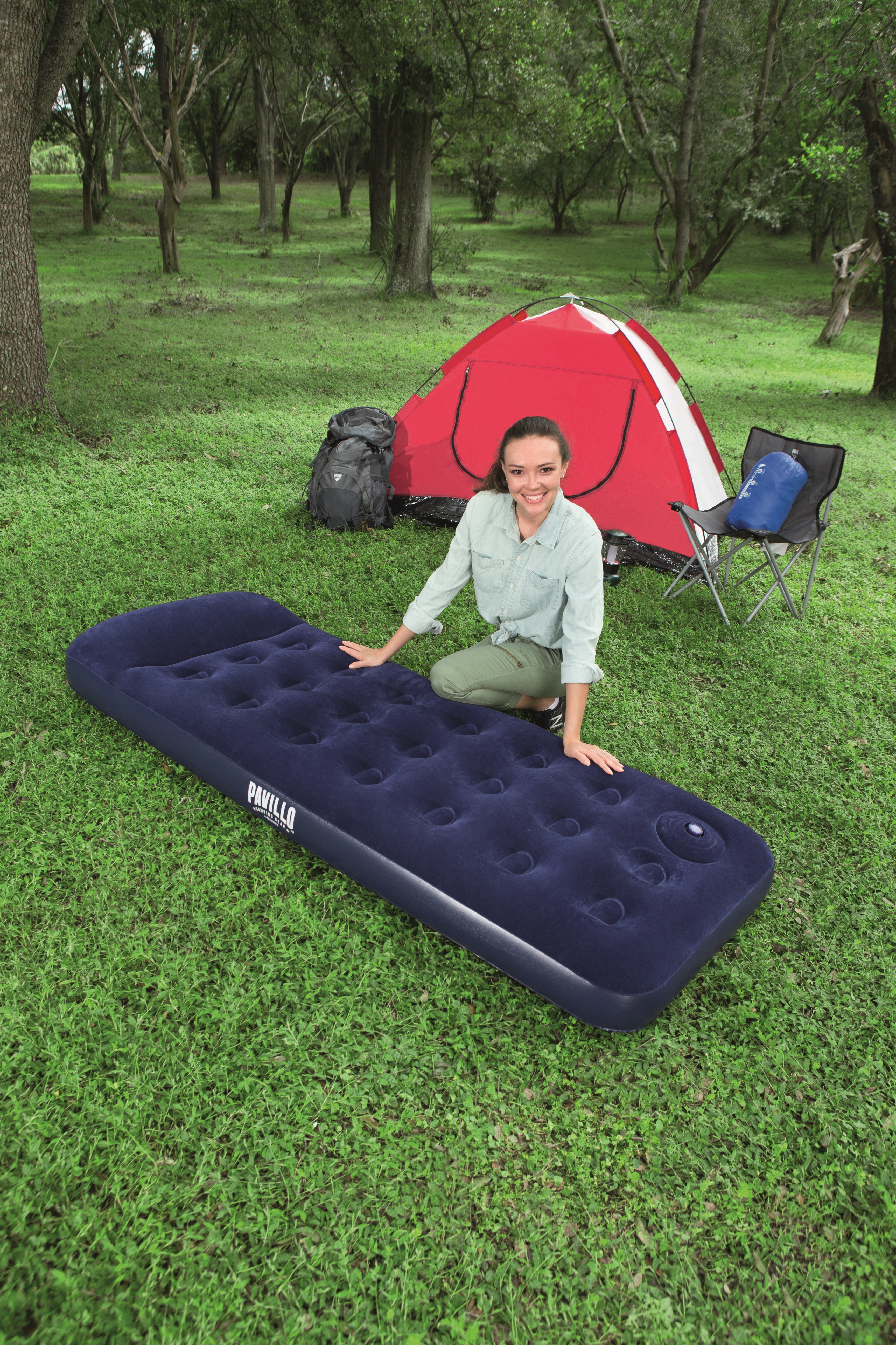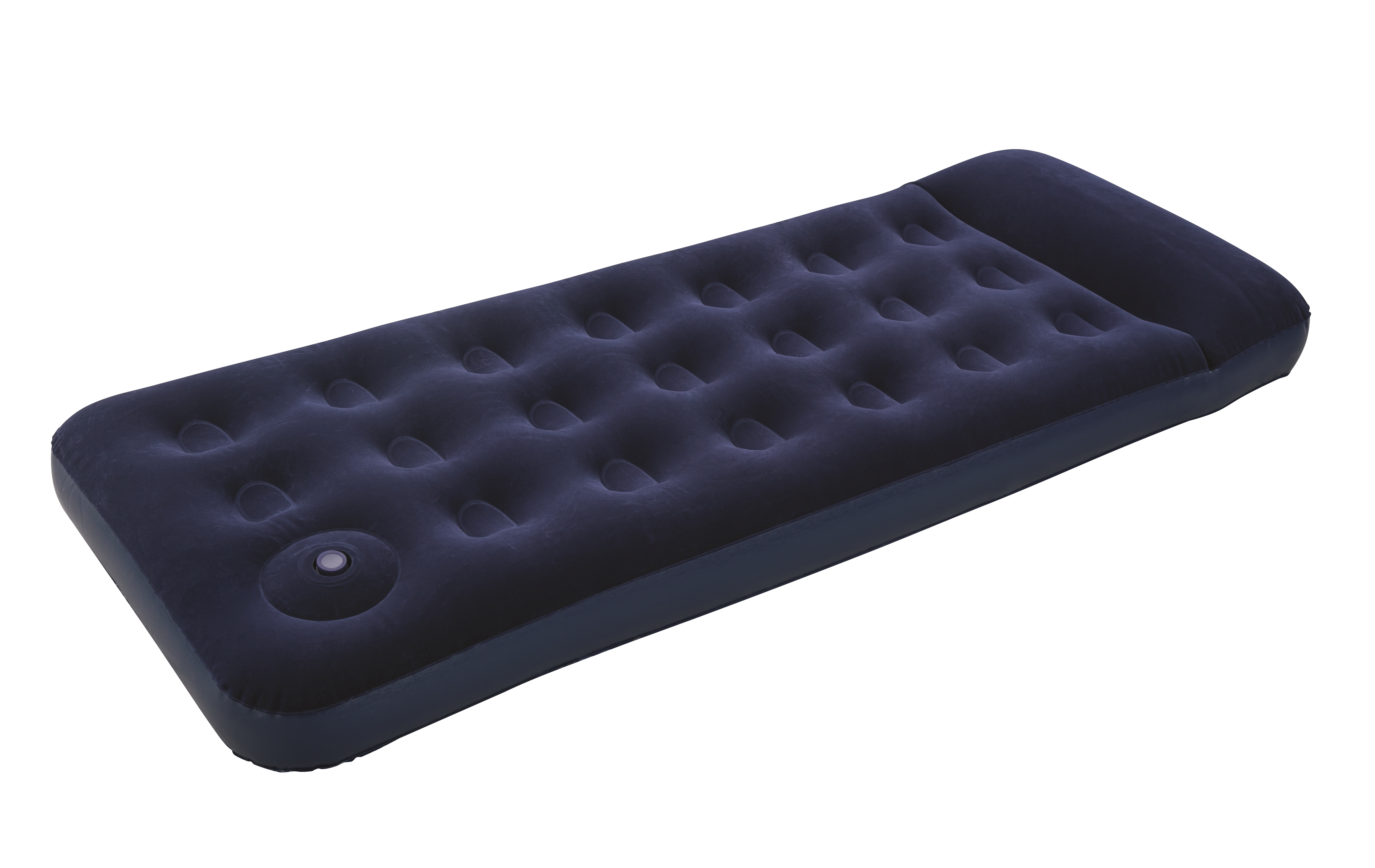 Gerieflijk luchtbed met ingebouwd hoofdkussen en eveneens ingebouwde voetpomp, single. Aangename flocked toplaag, ideaal voor zowel in- als outdoor. Met reparatie patch. Kleur: blauw. Afmeting: 185x76x28 cm.
