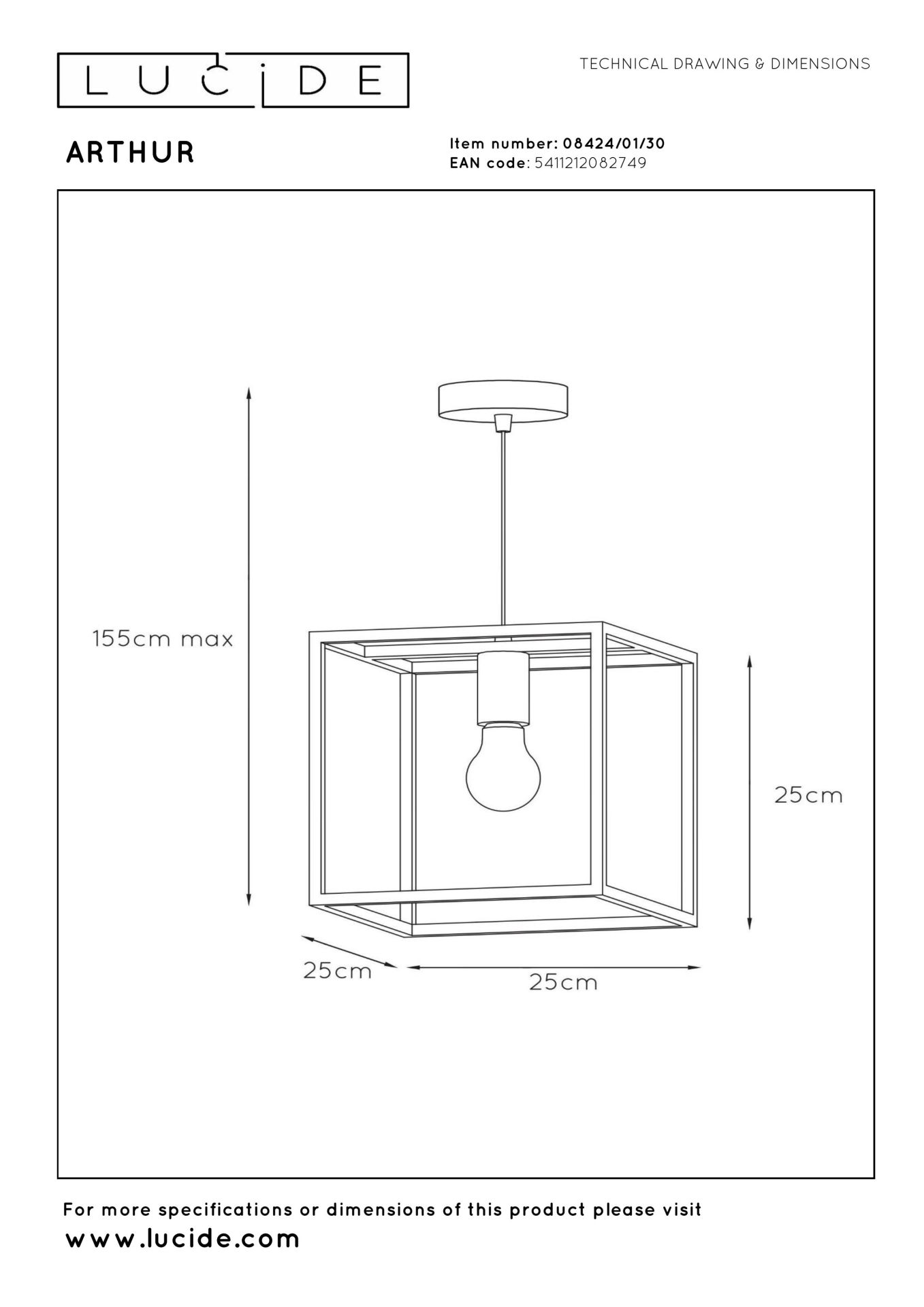 Lucide Arthur Hanglamp Zwart 1x60w E27 25x25x25 cm