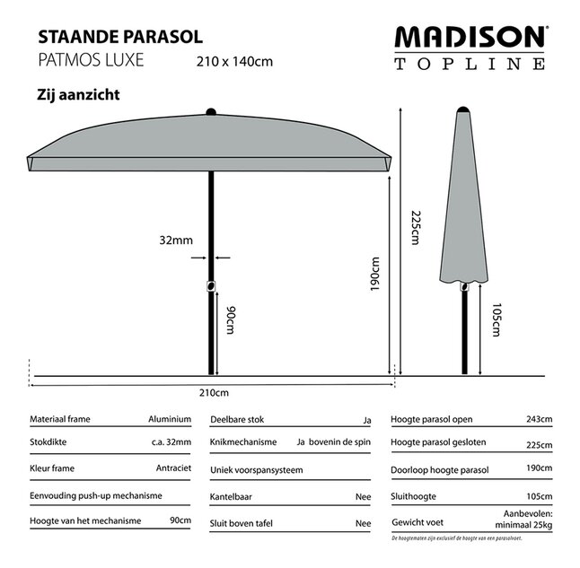 Madison Parasol Alu Patmos 210x140 cm Rechthoek met Flappen Grijs