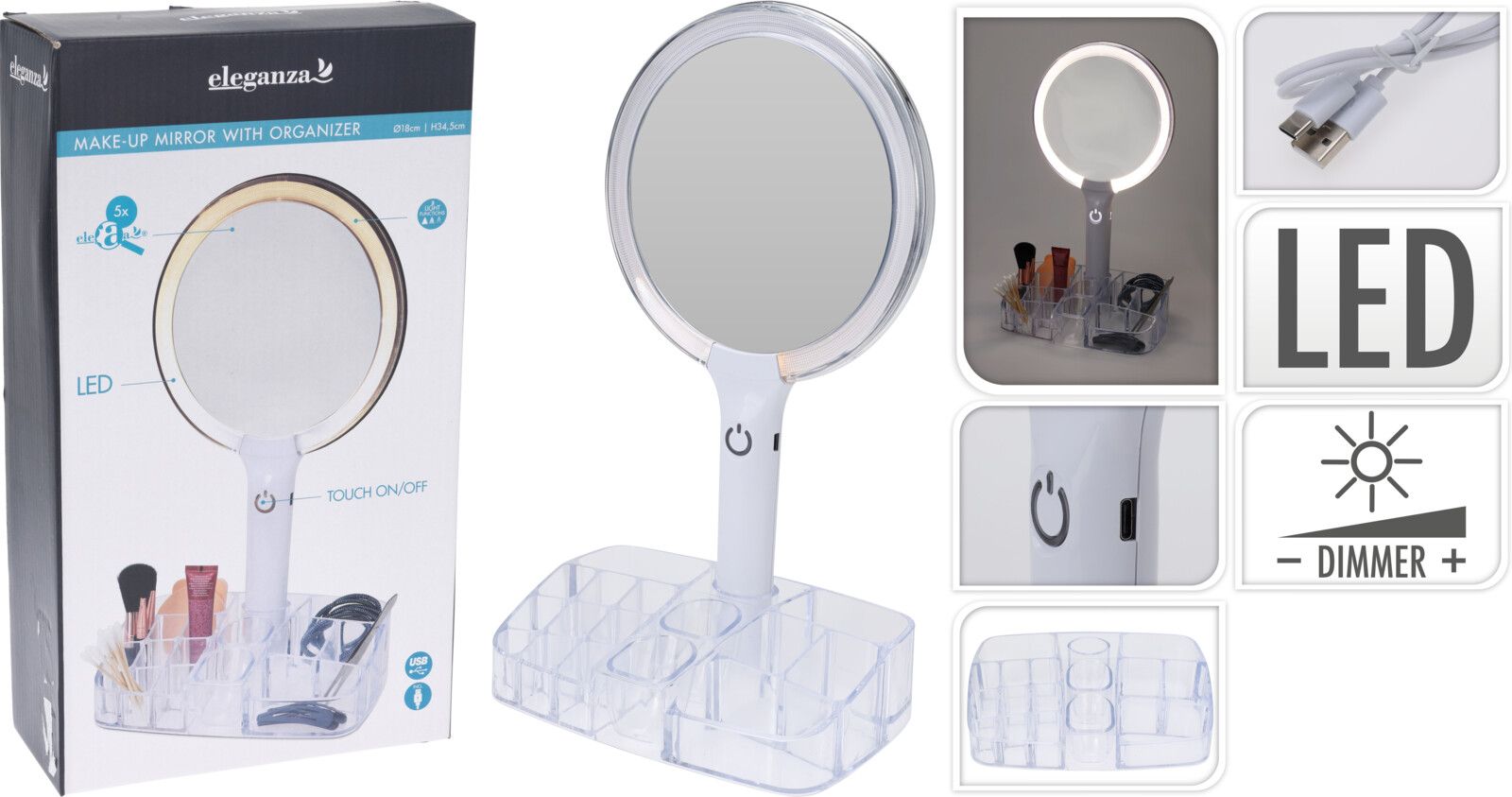 Make-up Spiegel LED 18cm met Organizer - Smart Touch - met USB-C Kabel