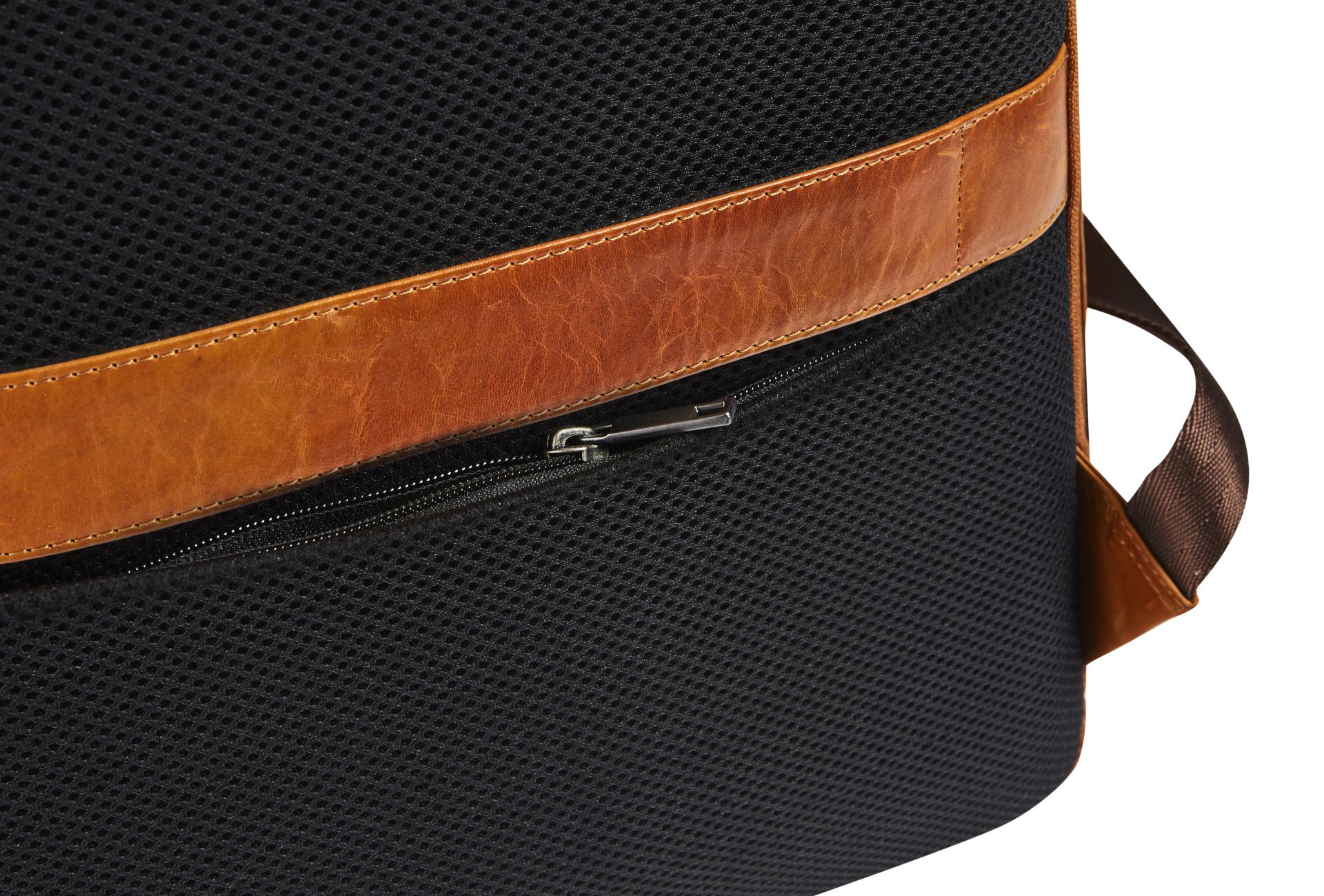 Stijlvolle, lederen rugzak met apart, verstevigd 14 inch laptopcompartiment. Voorzien van een anti-diefstal hidden pocket op de rugzijde. Regen? Geen nood, er zit een handige regenhoes bij!