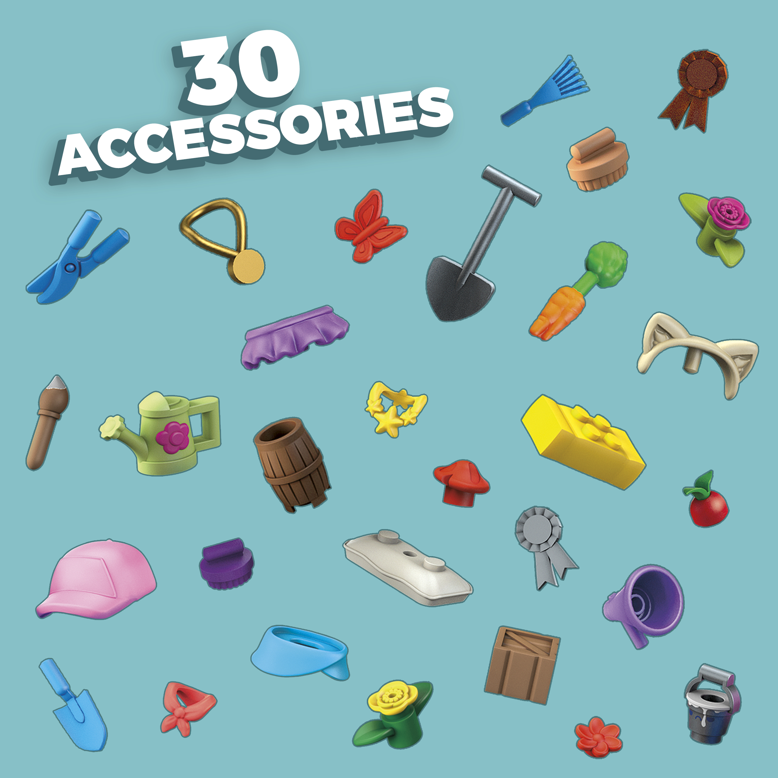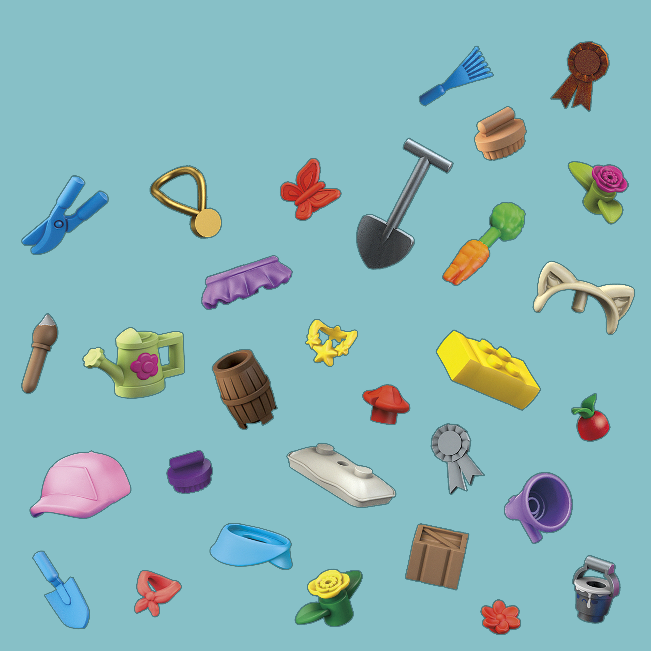 Bouw spelenderwijs de tuin, de schuur en de stallen, en verzin je eigen verhalen met accessoires zoals een wortel, linten, een borstel en meer