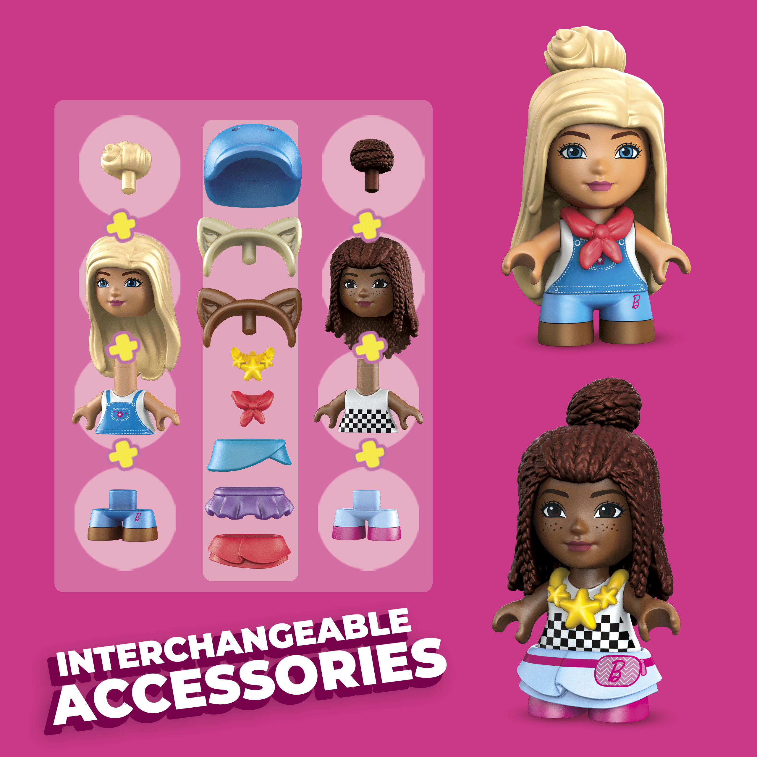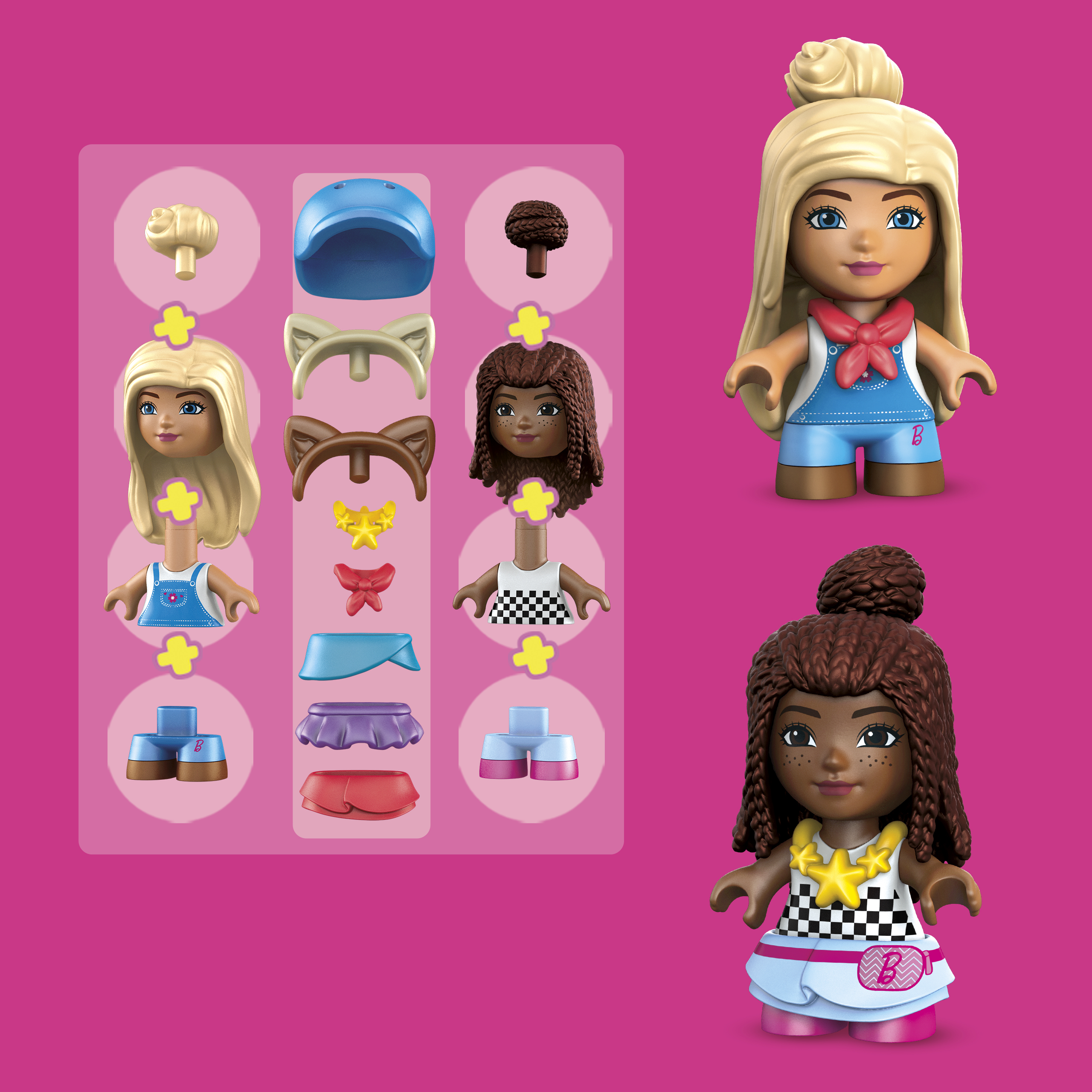 De bouwset bevat 3 Barbie micropoppen, 9 dieren, 286 bouwstenen inclusief speciale onderdelen en accessoires, en 3 hartvormige basisplaten om op te bouwen