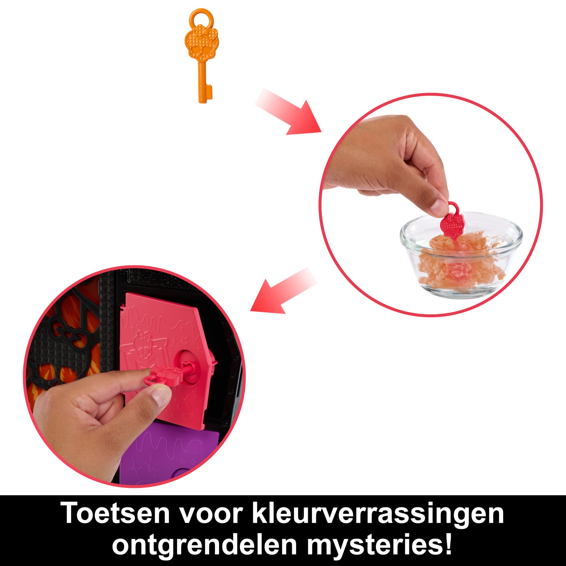 Skulltimate Secrets komt terug met de editie Neon Gruwelen -- en dit keer geeft het licht! Elke spannend gekleurde set bevat een Monster High pop en meer dan 19 verrassingen, waaronder drie accessoires die licht geven in het donker. De magie van Color Reveal en de stapsgewijze onthulling maken uitpakken een spookachtig pretje. De kluis in de vorm van een doodskist is ideaal om alles in op te bergen en verhalen mee te verzinnen. Per stuk verkrijgbaar en niet overal leverbaar. Met beweegbare ledematen. Poppen kunnen niet los staan. Kleuren en versieringen kunnen variëren.