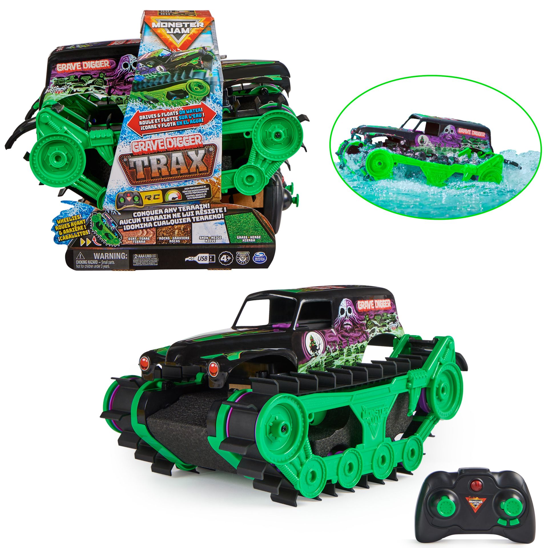 De Grave Digger Trax heeft een uniek ontwerp met rupsbanden voor elk terrein en drijft met gemak door het water. Rijd op land en baan je een weg over sneeuw, modder, rotsen en meer