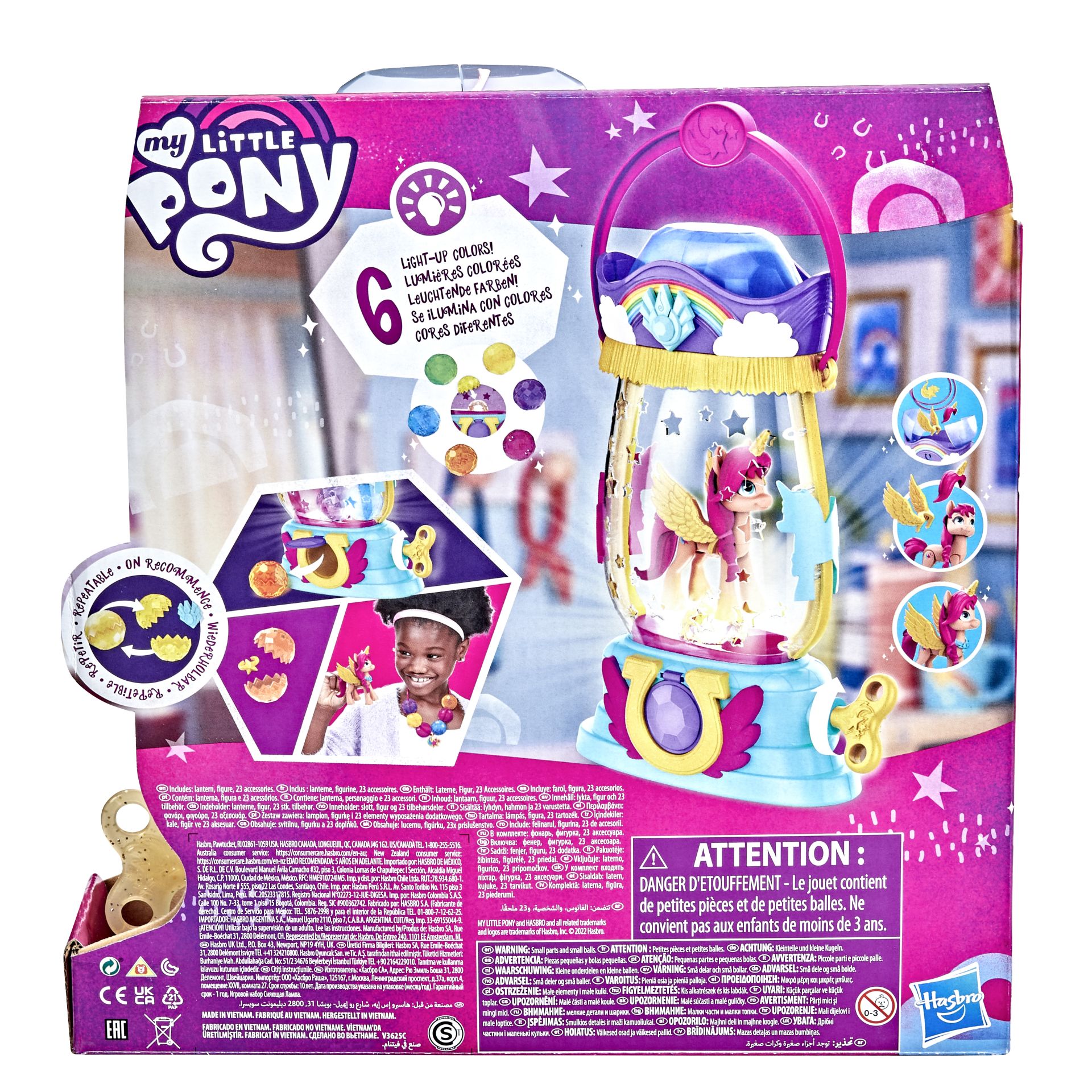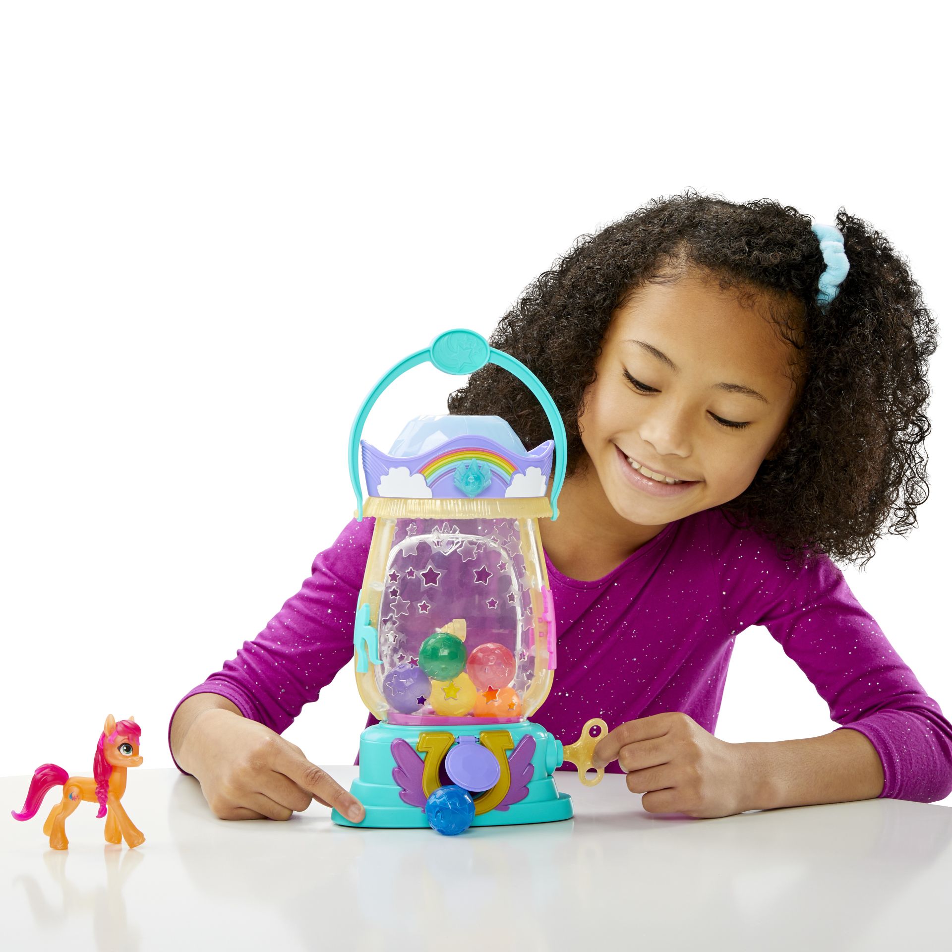Maak kennis met Sunny Starscout: een aardepony uit Maritime Bay! Sunny is nieuwsgierig, avontuurlijk en vastbesloten om van de wereld een betere plaats te maken. Ontdek een vrolijke verrassing met de sprankelende Sunny Starscout-lantaarn. Geïnspireerd op de film My Little Pony: A New Generation! Inclusief een oranje Sunny Starscout-ponyfiguur van 7,5 cm en een op het personage geïnspireerde cutie mark van een vallende ster op één kant. De figuur is beweegbaar en heeft roze haar van plastic, in haar typische vlechtstijl. Draai de sleutel om, om de lantaarn te laten oplichten en de kristalvormige houders te gebruiken. In elke houder vind je verrassingsaccessoires, en ook bovenin de lantaarn! Plaats de kristalvormige houders over de lantaarn om de lichtkleur te veranderen - er zijn 6 verschillende kleuren! Fans van vroeger en nu kunnen allerlei avonturen verzinnen met het speelgoed geïnspireerd op de film My Little Pony. Perfect als geschenk voor kerst of een verjaardag voor kinderen vanaf 5 jaar! My Little Pony en alle gerelateerde personages zijn handelsmerken van Hasbro.