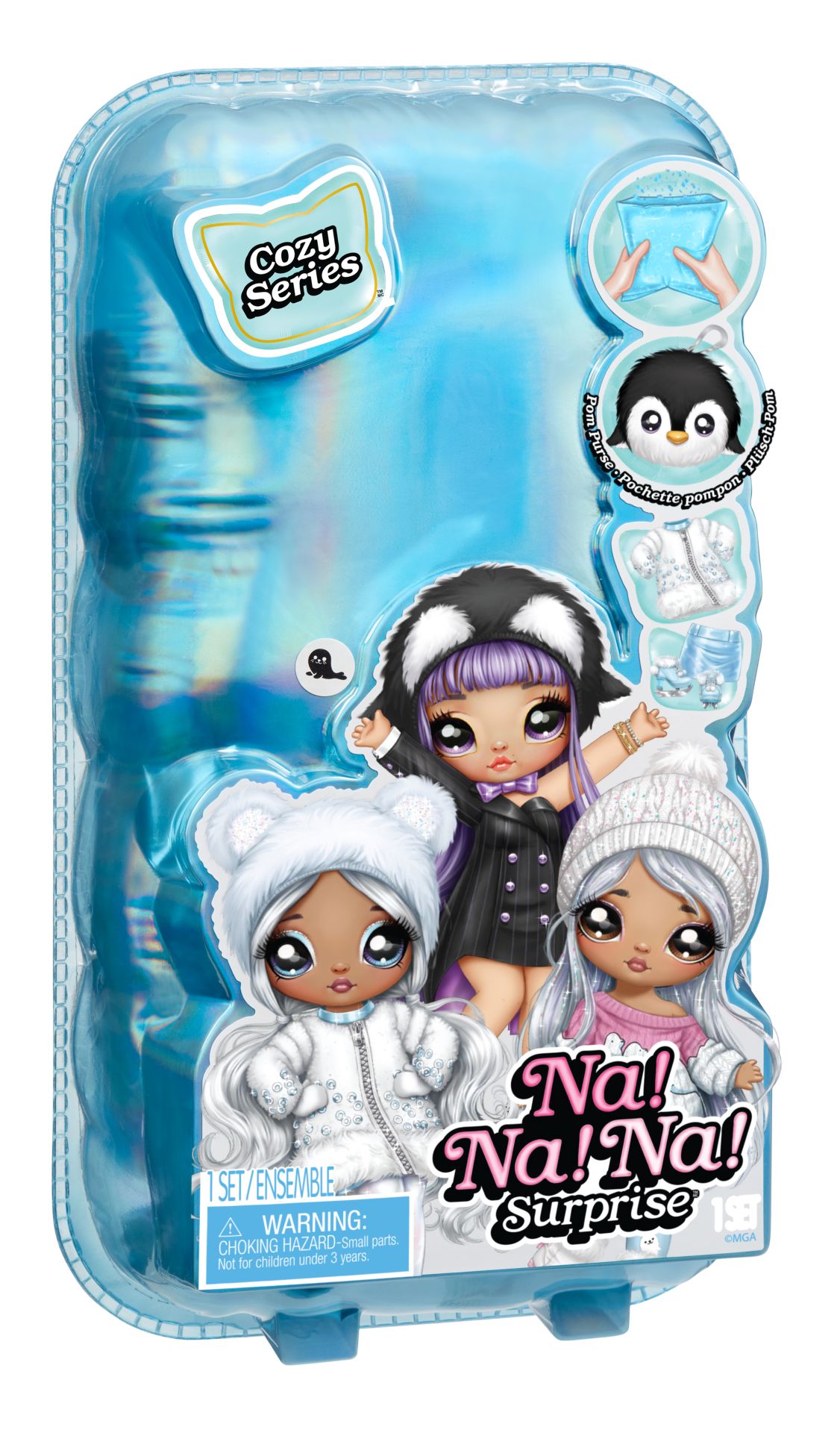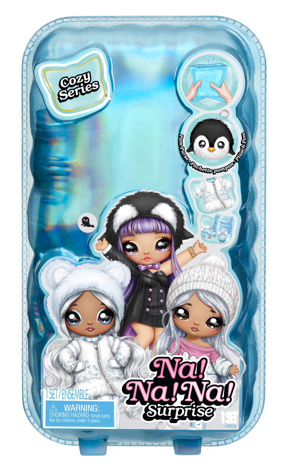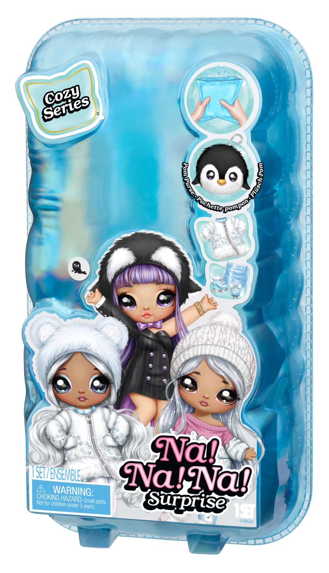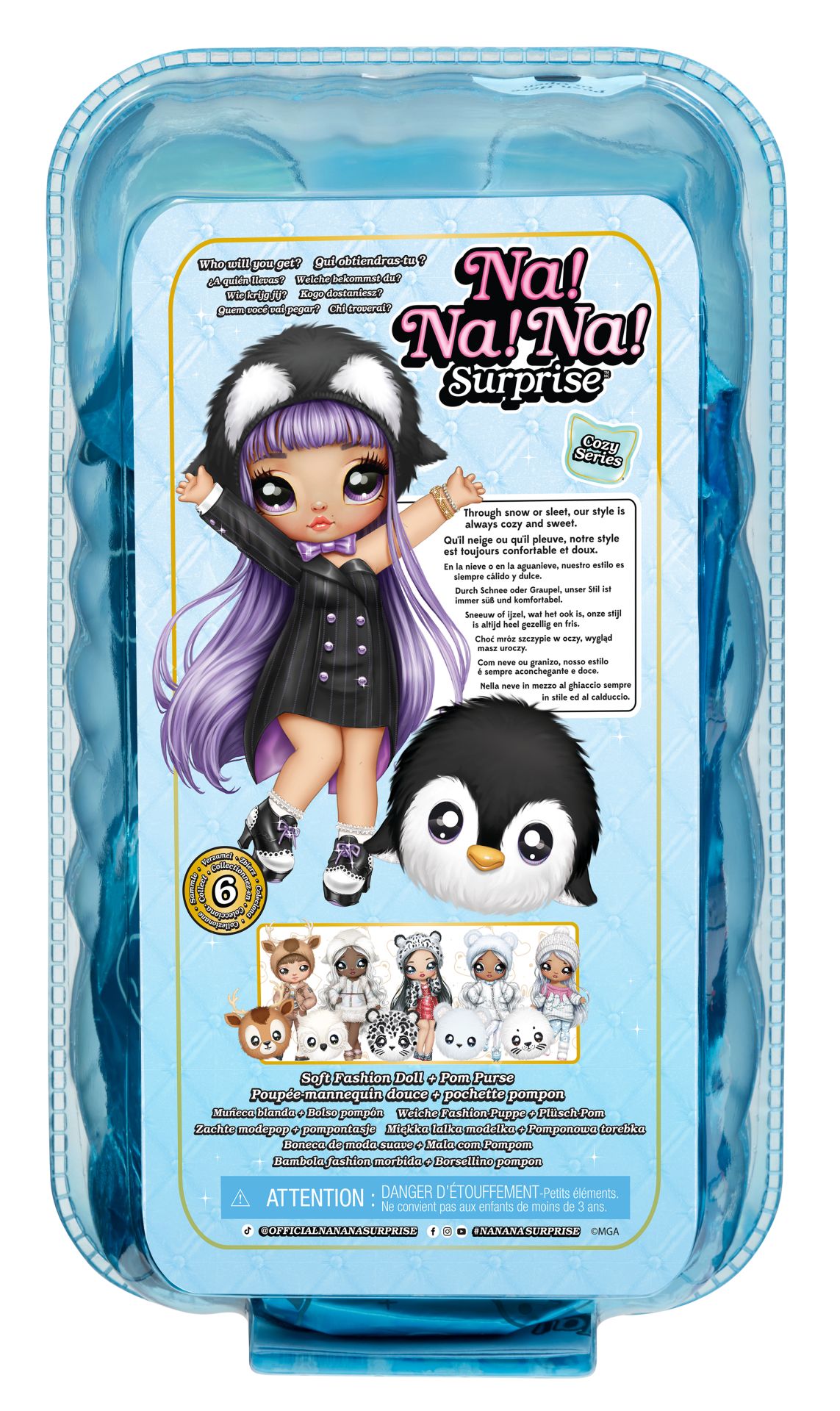 In sneeuw of hagel, onze stijl is altijd knus en lief. Maak kennis met de gloednieuwe Na Na Na Surprise Cozy-serie 2-in-1 zachte modepoppen! Je krijgt 2-in-1 met een zachte, poseerbare modepop én een verzamelbaar pompontasje van pluizige stof met dierenthema en clip! De poppen uit de Cozy-serie hebben op een dier geïnspireerde wintermode, een geprint gezichtje en geprinte kledingdetails plus een bijpassende, puizige beanie. Maak kennis met Harper Waters! Ze heeft prachtig lichtpaars haar, een geprint gezichtje en geprinte kledingdetails plus schitterende mode. Haar outfit is geïnspireerd op een zeehond. Ze draagt een gebreide, oversized trui met ingeweven zeehondjestekeningen en leggings met zeehondenprint, een beanie met kabelsteek en pompon en laarzen afgezet met nepbont. De pop zit in een ondoorzichtige verpakking en blijft een mysterie tot je onthult wie het is door een spannende confettiballon-uitpakervaring. Open de verpakking en ontdek een folieballon in de vorm van een tas binnenin. Steek het inbegrepen rietje (vastgeplakt aan de binnenkant van de verpakking) tot halverwege in het lipje aan de onderkant van de ballon, blaas de ballon op (niet te hard), trek voorzichtig het geperforeerde strookje boven op de sticker op de ballon eraf en knijp nu voorzichtig in de ballon voor een confettiverrassing! Scheur de ballon open om te onthullen welke pop je hebt gekregen! Zes stijlen om te verzamelen!