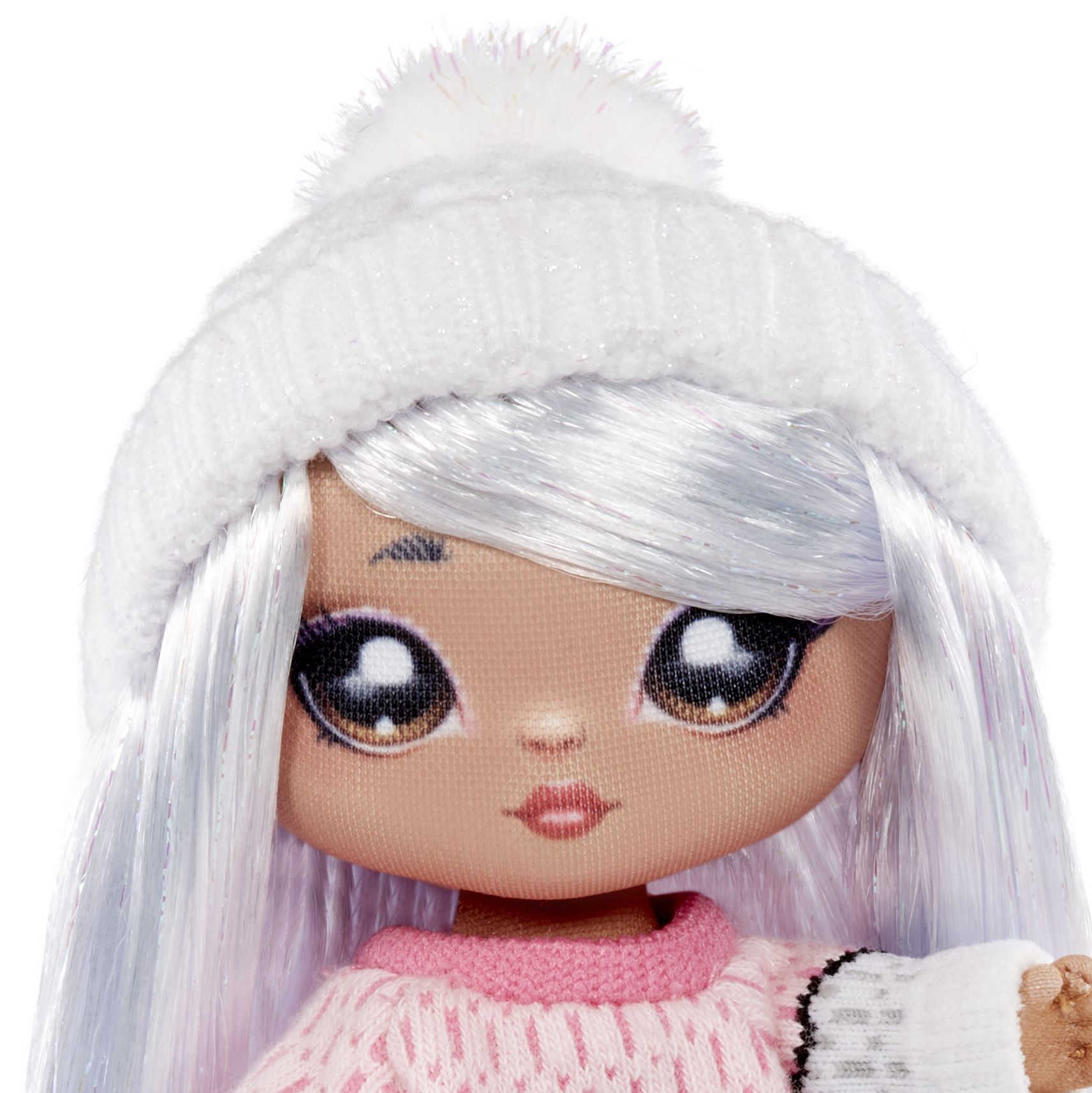 2-IN-1 POP EN TASJE MET WINTERTHEMA: in sneeuw of hagel, onze stijl is altijd knus en lief. Inclusief een prachtige, zachte, op een dier geïnspireerde modepop van 19 cm plus bijpassend pompontasje van pluizige stof met clip om aan een rugzak te hangen