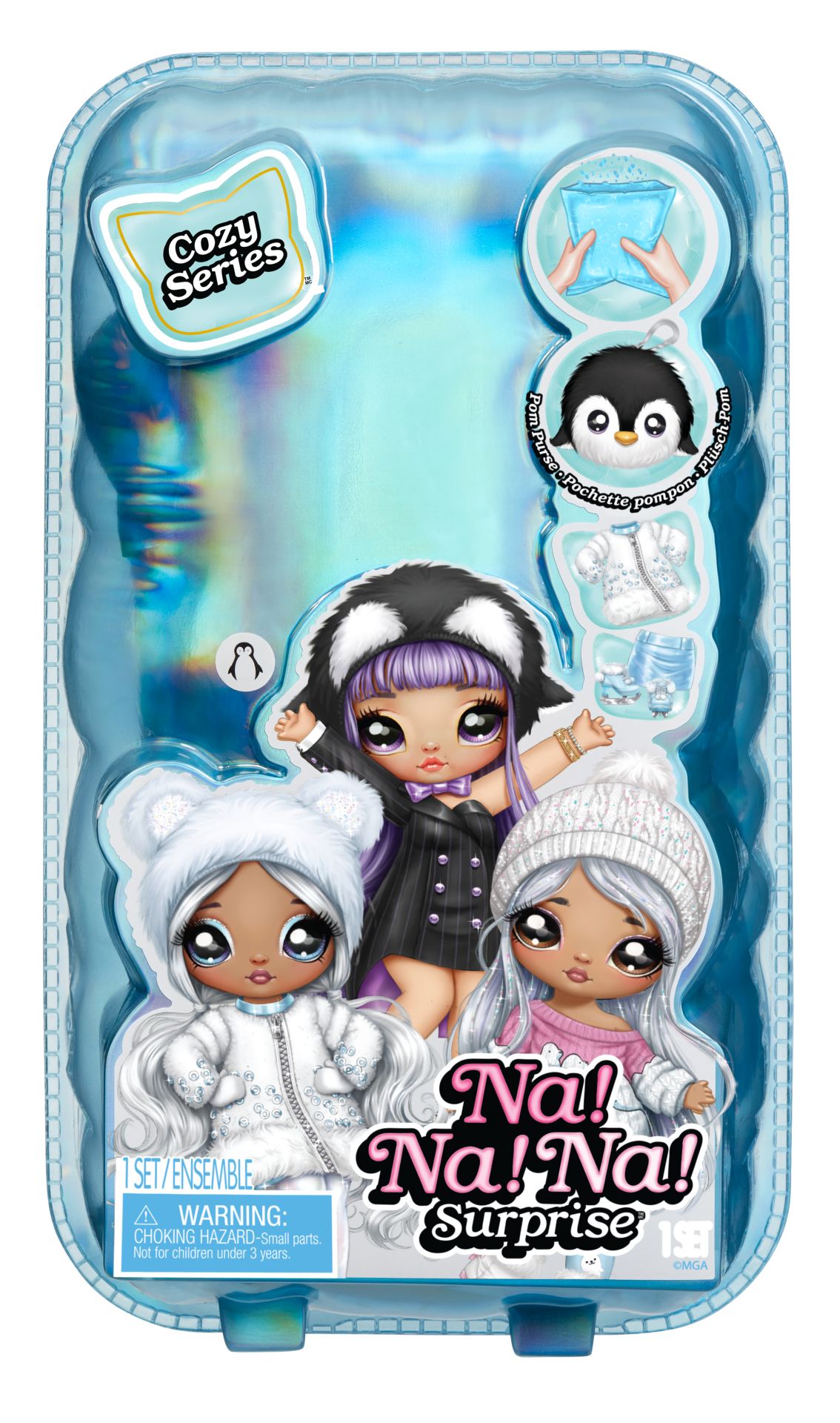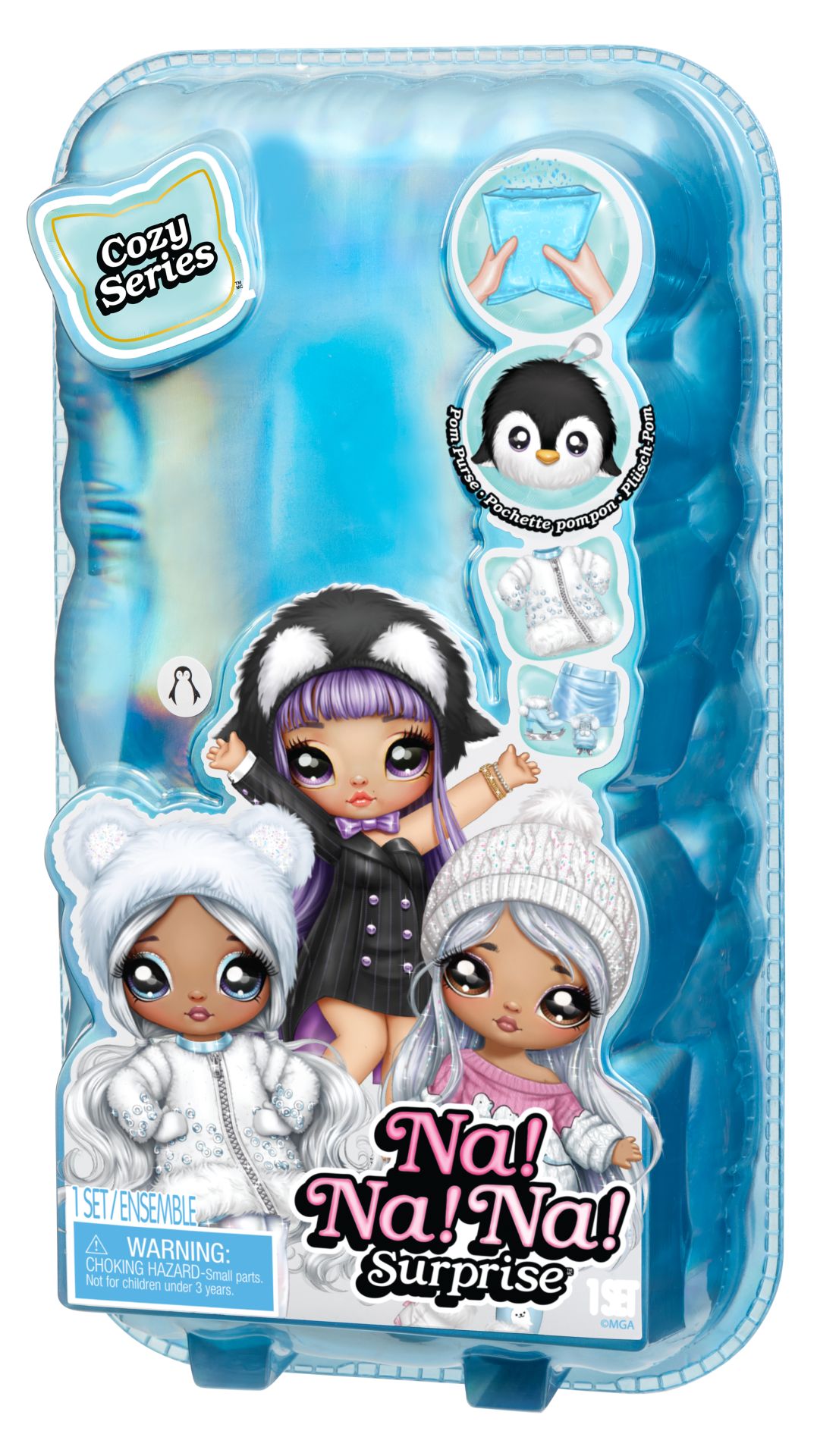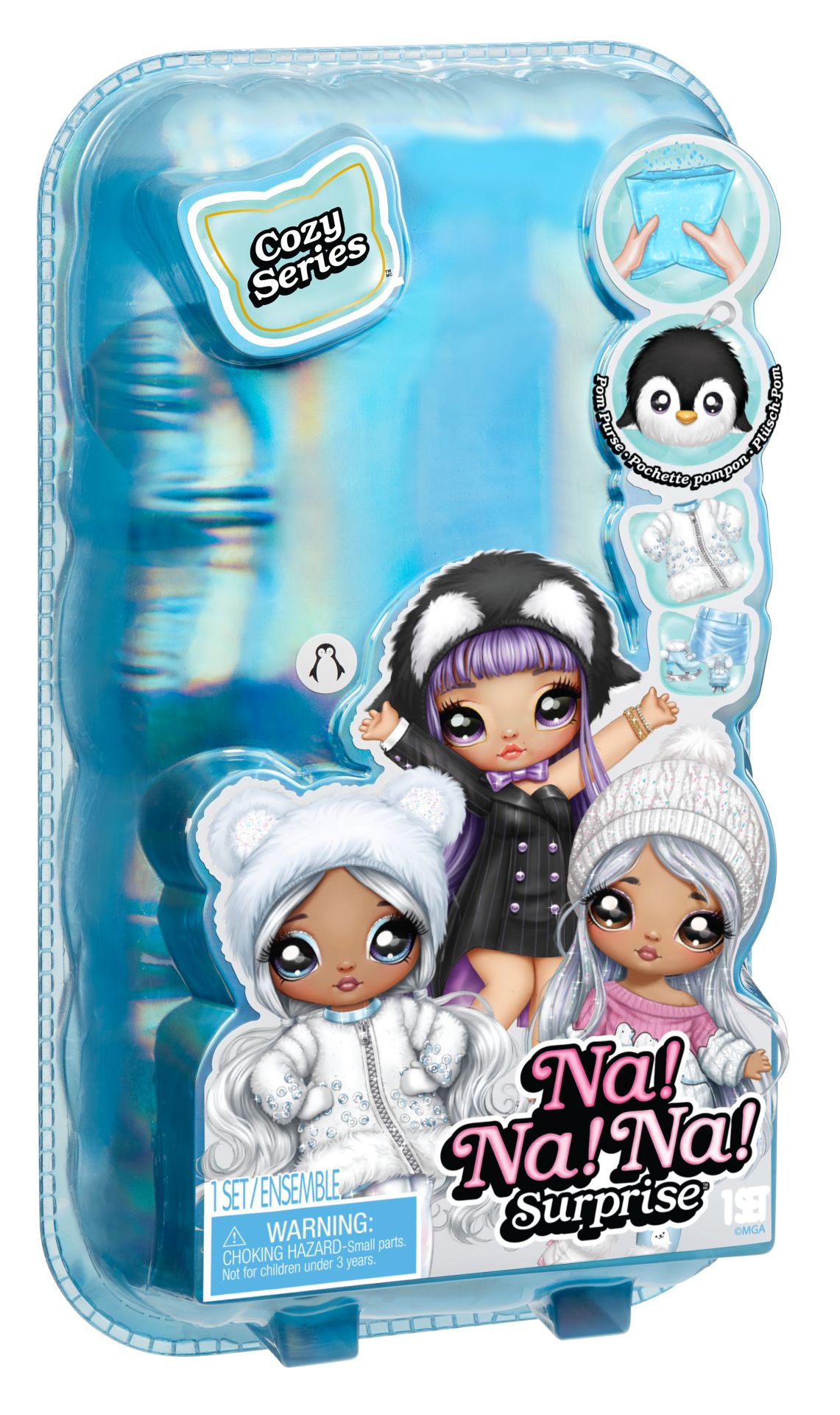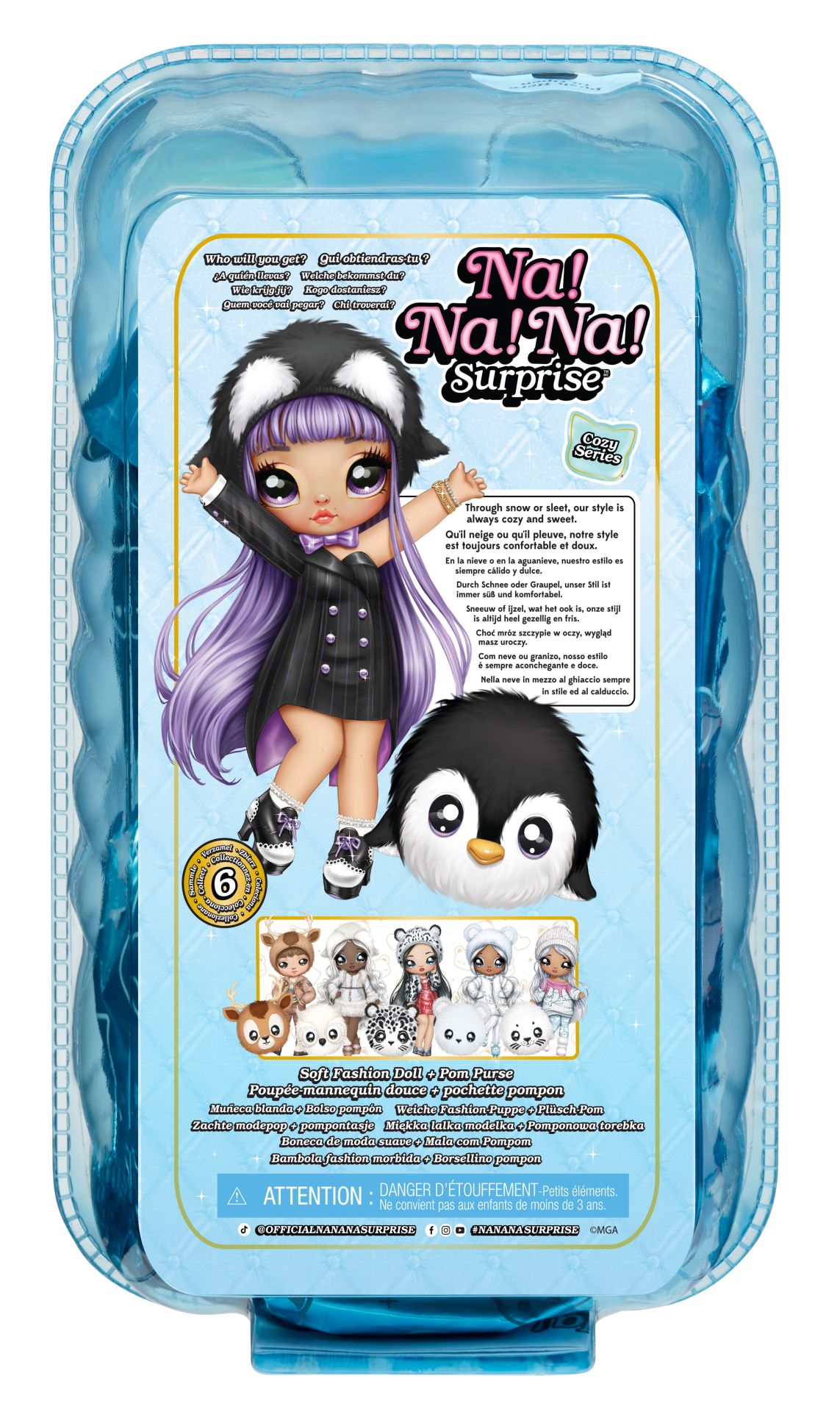 In sneeuw of hagel, onze stijl is altijd knus en lief. Maak kennis met de gloednieuwe Na Na Na Surprise Cozy-serie 2-in-1 zachte modepoppen! Je krijgt 2-in-1 met een zachte, poseerbare modepop én een verzamelbaar pompontasje van pluizige stof met dierenthema en clip! De poppen uit de Cozy-serie hebben op een dier geïnspireerde wintermode, een geprint gezichtje en geprinte kledingdetails plus een bijpassende, puizige beanie. Maak kennis met Isla Waddles! Ze heeft prachtig paars haar, een geprint gezichtje en geprinte kledingdetails plus schitterende mode. Haar outfit is geïnspireerd op een pinguïn. Ze is gekleed in een zwarte jurk met krijtstreep, een gekleurde satijnen voering en gegoten knopen, satijnen vlinderdas met bijpassende pluizige beanie met pinguïnthema en hakken met strik. De pop zit in een ondoorzichtige verpakking en blijft een mysterie tot je onthult wie het is door een spannende confettiballon-uitpakervaring. Open de verpakking en ontdek een folieballon in de vorm van een tas binnenin. Steek het inbegrepen rietje (vastgeplakt aan de binnenkant van de verpakking) tot halverwege in het lipje aan de onderkant van de ballon, blaas de ballon op (niet te hard), trek voorzichtig het geperforeerde strookje boven op de sticker op de ballon eraf en knijp nu voorzichtig in de ballon voor een confettiverrassing! Scheur de ballon open om te onthullen welke pop je hebt gekregen! Zes stijlen om te verzamelen!