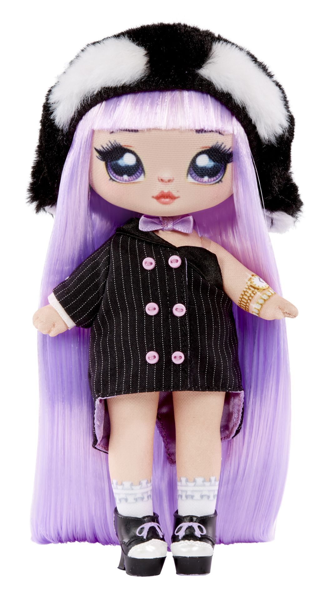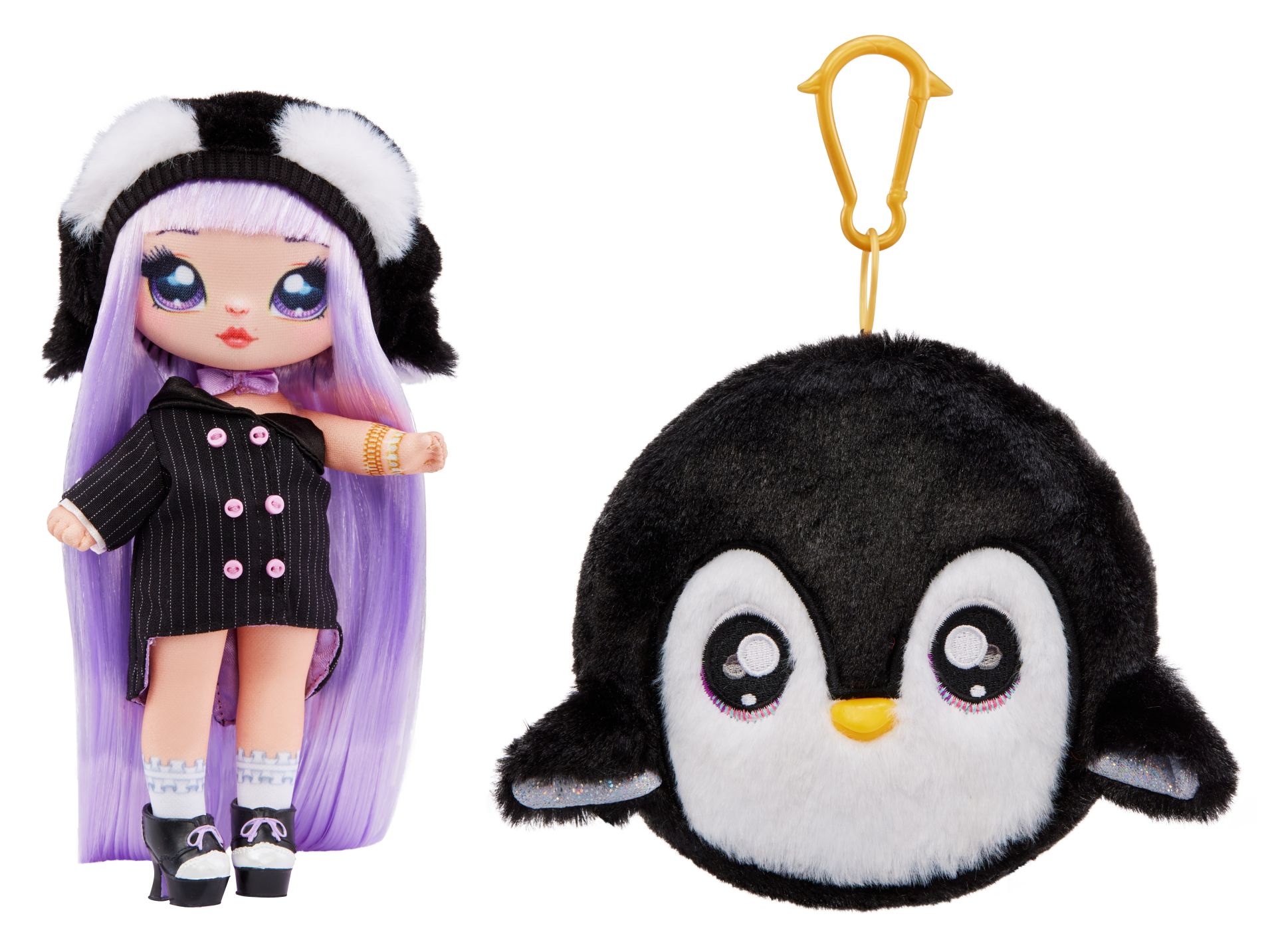 HET ZIT 'M ALLEMAAL IN DE DETAILS: maak kennis met Isla Waddles! Ze heeft prachtig paars haar, een geprint gezichtje en geprinte kledingdetails plus schitterende mode. Haar outfit is geïnspireerd op een pinguïn. Ze is gekleed in een zwarte jurk met krijtstreep, een gekleurde satijnen voering en gegoten knopen, satijnen vlinderdas met bijpassende pluizige beanie met pinguïnthema en hakken met strik