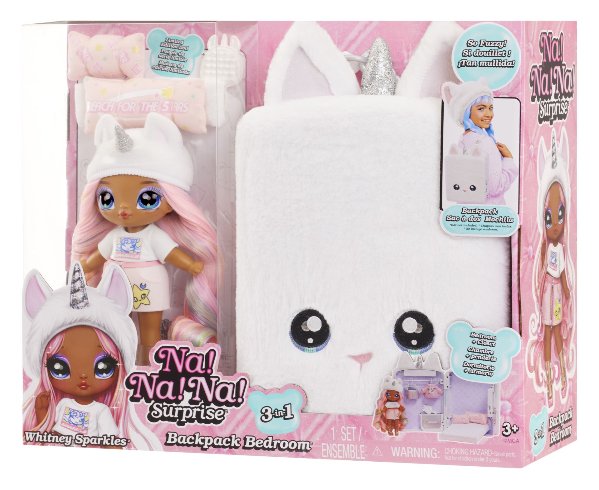 Pak de meest modieuze speelset voor je poppen uit met de Na! Na! Na! Surprise-rugzak-slaapkamer. Een 3-in-1 schattige, zachte speelset: een stijlvolle, witte eenhoornrugzak, een schattige slaapkamerspeelset met kast en Whitney Sparkles, een zachte, buigbare modepop. De supermooie rugzak is zacht en pluizig, met een look die perfect past bij de eenhoornstijl van Whitney. Open hem om een slaapkamerspeelset te onthullen met opklapbed, kast met echt werkende lade, kussens, deken en kledinghangers. Allemaal met lieve eenhoorndetails.Whitney heeft prachtig, lang roze haar, een pluizige eenhoornmuts en ze draagt een exclusieve outfit en schoenen. Als je klaar bent met spelen, pak je alles weer in en neem je de rugzak onderweg mee. Twee stijlen om te verzamelen.