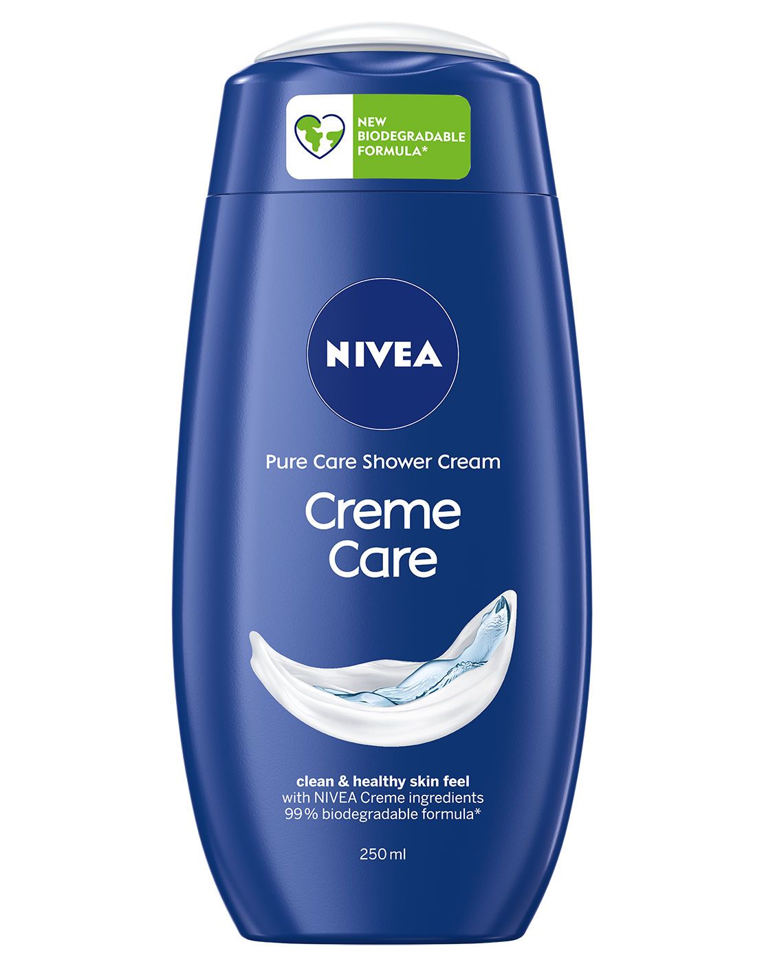 NIVEA Creme Care verzorgende douchegel verzorgt je huid en laat haar glad, gehydrateerd en langdurig gezond aanvoelen. Samengesteld met vitamine C en E, kostbare oliën en de unieke NIVEA Creme geur, is deze body wash dermatologisch goedgekeurd en heeft een perfecte balans tussen verzorgende en reinigende eigenschappen. Formule die het microbioom van de huid respecteert. Beschermt de huid tegen uitdrogen. 99% biologisch afbreekbare formule. pH-huidneutraal. Fles gemaakt van 97% recycled materiaal. De verzorgende formule met vitamine C, E, oliën & sheaboter.