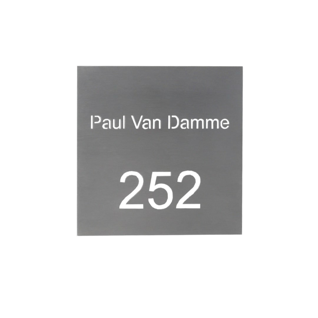 Nummer en Naamgravure op Inoxplaat 18x18 cm - Gelaserd