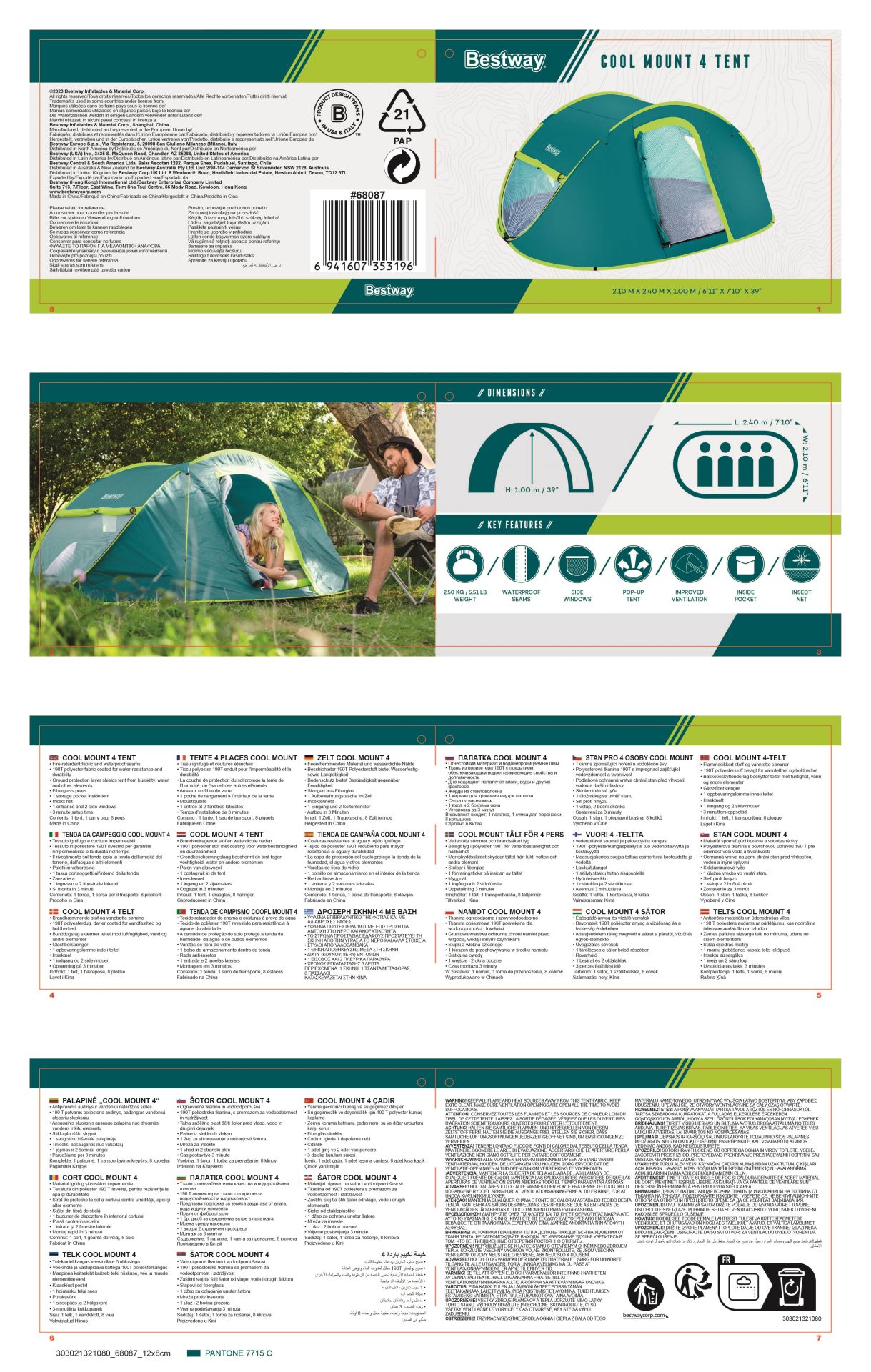 De Bestway Cool Mount 4 Tent is perfect om dag en nacht van de natuur te genieten. De compacte grootte is geweldig voor maximaal 4 personen of u nu gaat kamperen, op een festival bent of wilt ontspannen op het strand. De Cool Mount 4 is een must-have accessoire om te sterrenkijken in uw achtertuin, of voor een wandelweekend, en is compact genoeg om in de koffer van uw auto te passen of aan uw wandelrugzak te bevestigen. Deze handige tent is snel en gemakkelijk op te zetten, wat slechts 3 minuten in beslag neemt, en het komt met een grondbeschermlaag om de tent te beschermen tegen vochtigheid, water en andere elementen. Het heeft ook een insectennet; het ademende gaas houdt insecten buiten en laat de koele frisse lucht binnen. Daarboven, heeft de tent een constructie met enkele laag, één ingang en 2 zijramen om dag en nacht voldoende ventilatie toe te laten. Bovendien is er een binnenzak voor extra opslagruimte! De Bestway Cool Mount 4 Tent komt met een eigen draagtas, waardoor het voor iedereen de perfecte oplossing is voor onderweg.