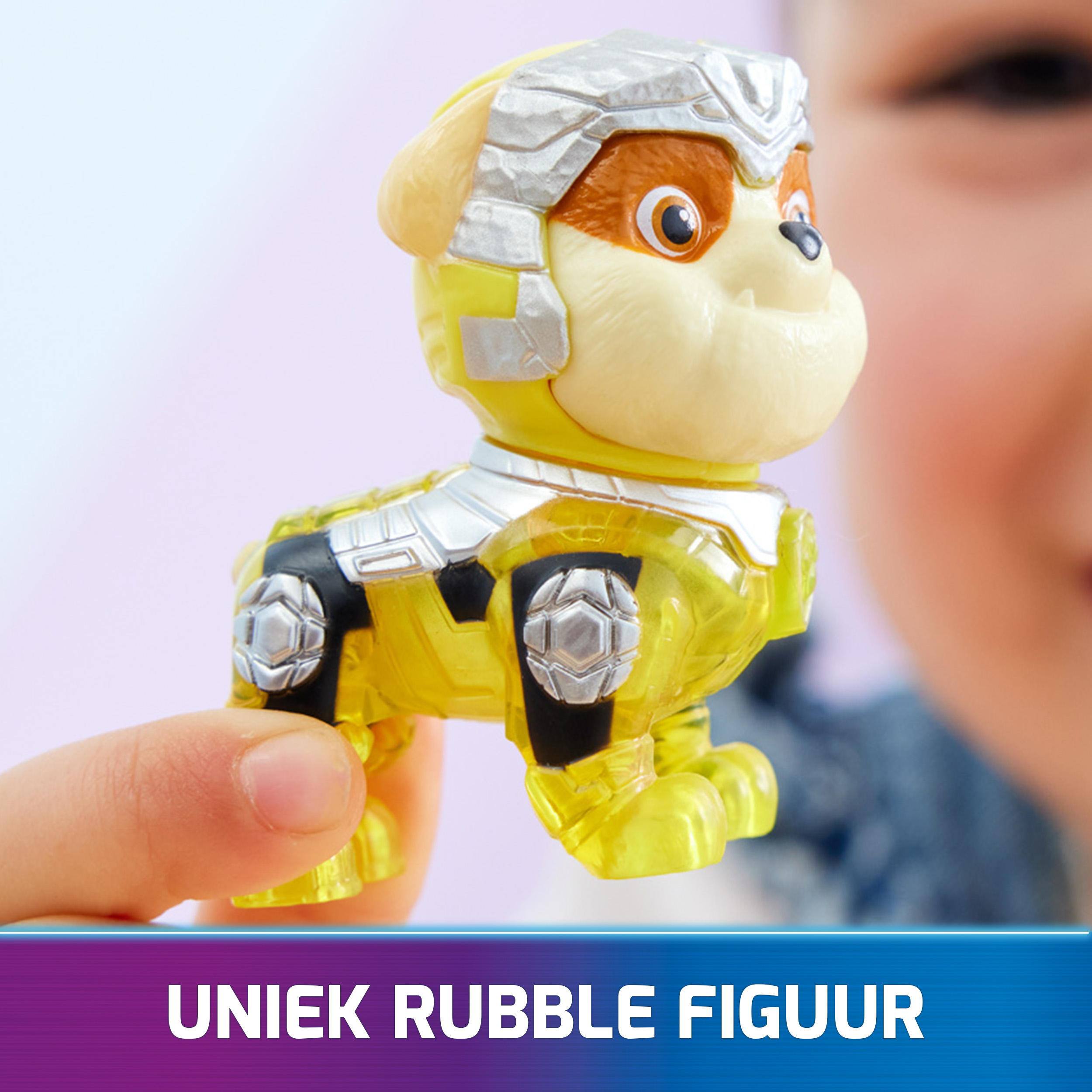 Dit unieke Rubble-speelgoedfiguur met zijn PAW Patrol The Mighty Movie-uniform is een must-have. Het heeft doorzichtige delen die oplichten wanneer hij in zijn voertuig zit