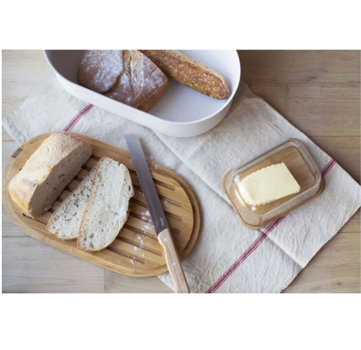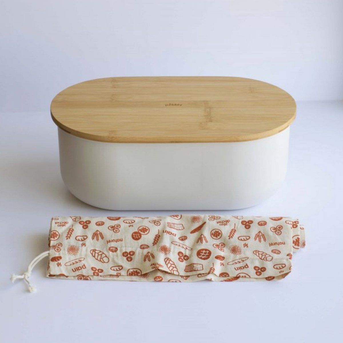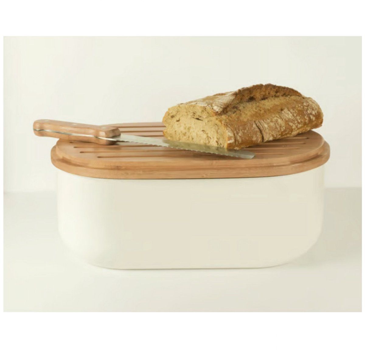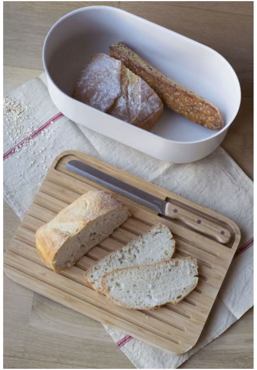 Pebbly Broodtrommel Crème 36x20x13 cm - Deksel als Snijplank - met Broodmes 32cm & Broodzak Katoen - Metaal/Bamboe