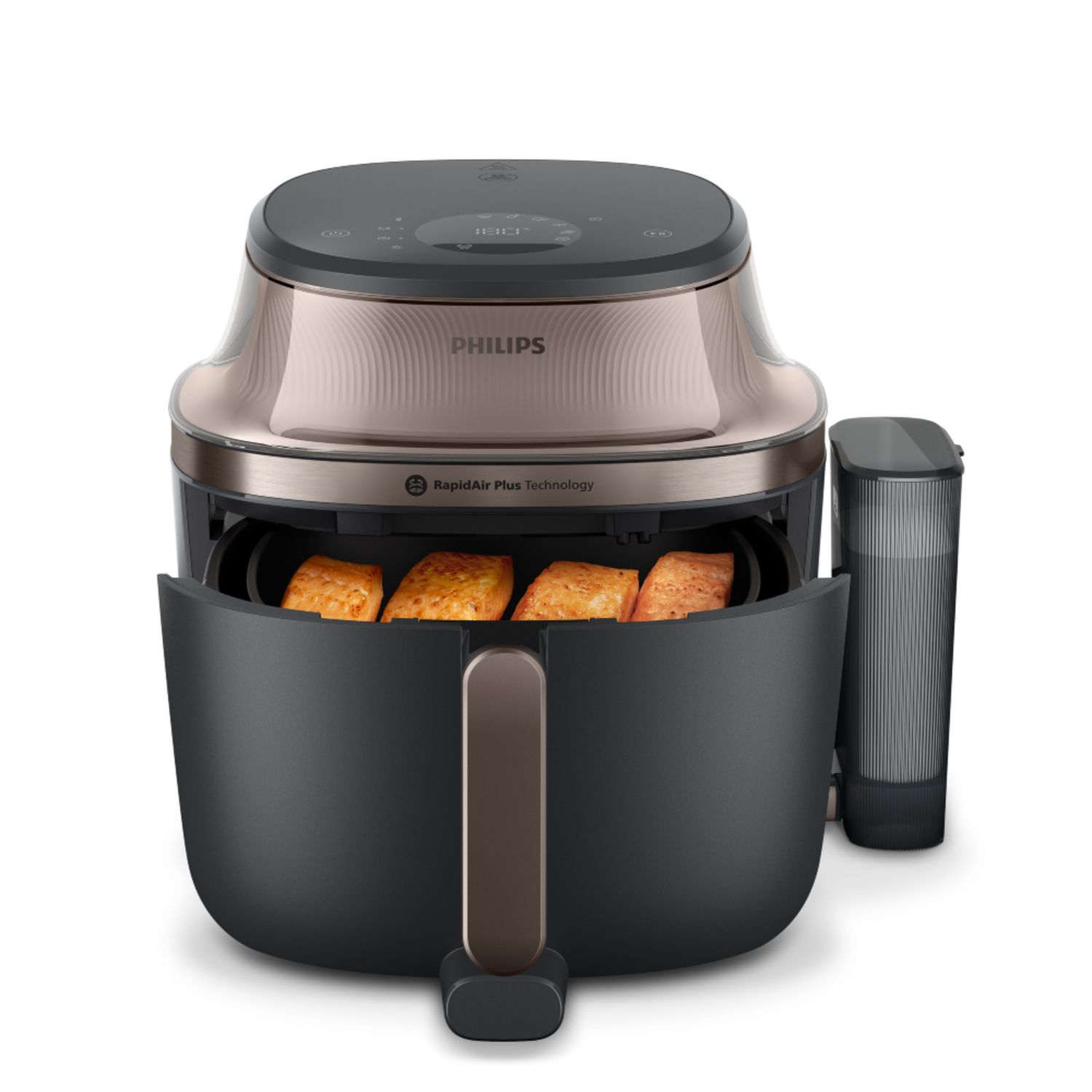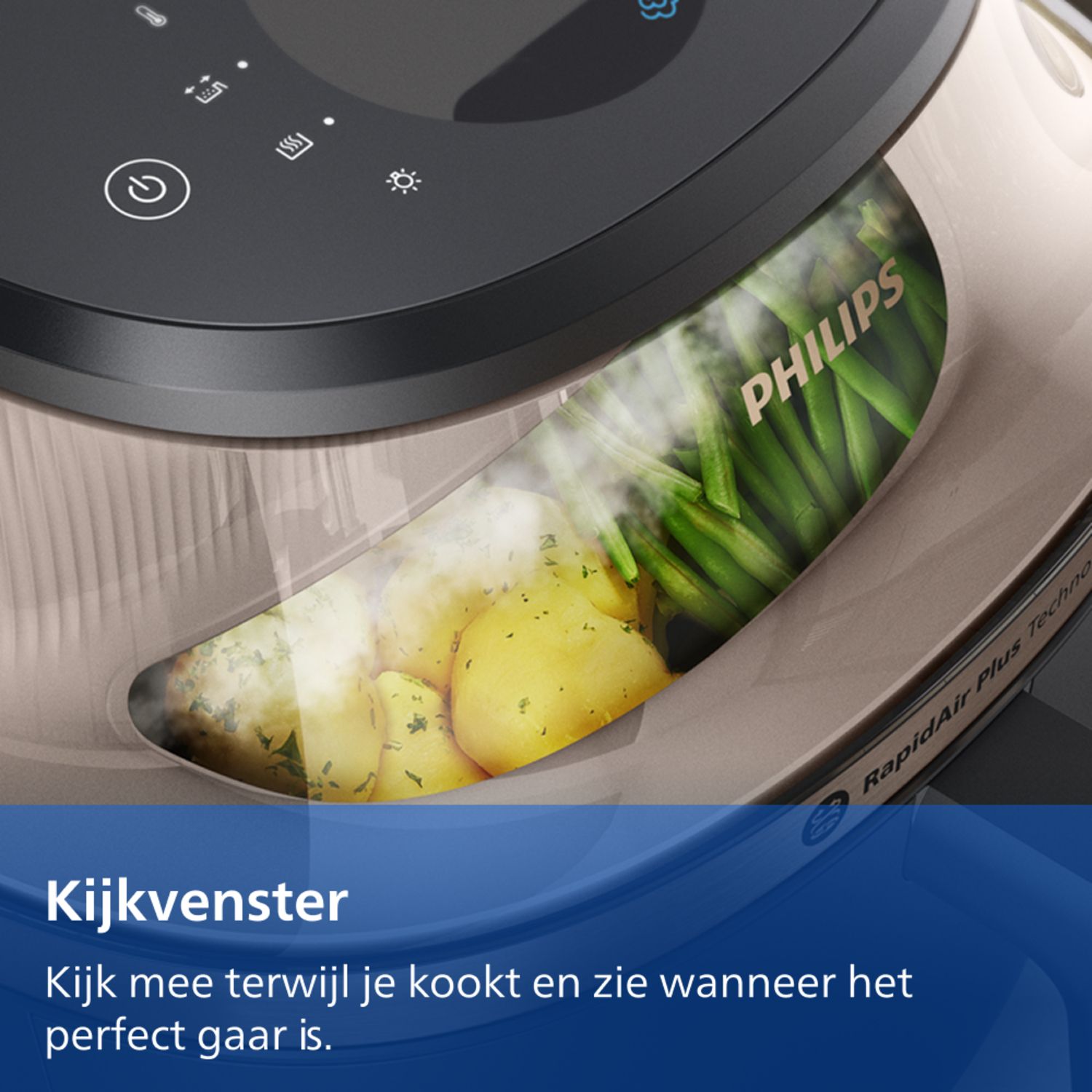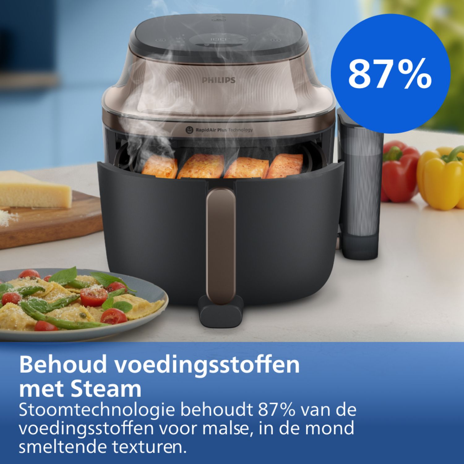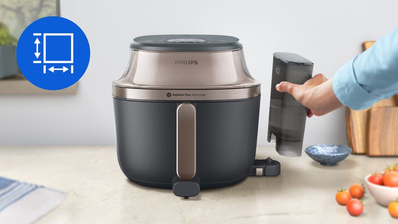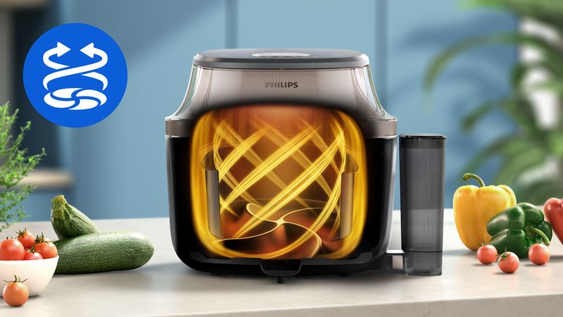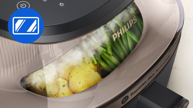 Nooit meer aanbranden of ongaar. RapidAir Plus blaast hete lucht met hoge snelheid door en rondom het voedsel, voor een gelijkmatiger en sneller resultaat, zodat je meer ingrediënten tegelijk kunt bereiden.***. Voor perfect gegaarde maaltijden met tot 90% minder vet.*