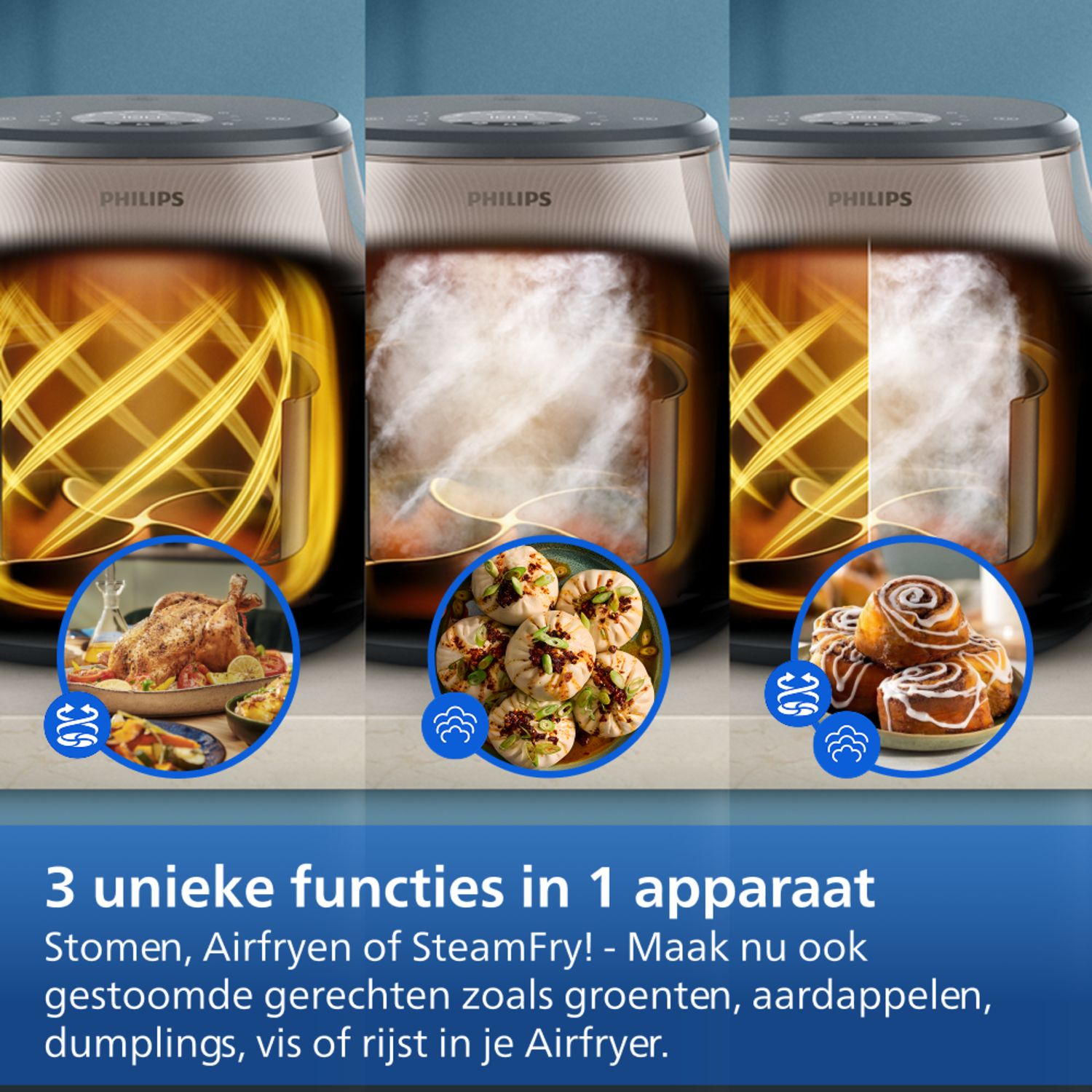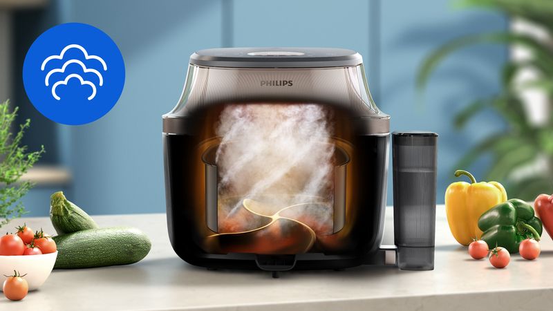 Geniet van heerlijke maaltijden: van luchtige gestoomde bao buns tot knapperige kip en sappige zalm. Ontdek een wereld aan nieuwe texturen met de Philips Airfryer 5000-serie met stoom.
