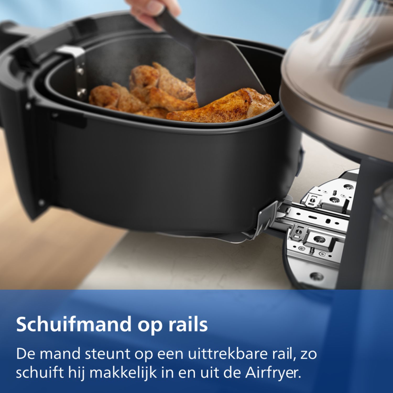 Of je nu maar één hand vrij hebt of snel toegang nodig hebt tijdens het koken, onze gepatenteerde EasySlide Rail-technologie******* maakt het controleren, schudden of toevoegen van ingrediënten eenvoudiger dan ooit. De mand schuift soepel en blijft altijd rechtop en stabiel op de rails, voor een veiligere en soepelere kookervaring dan wanneer u de mand op het aanrecht zou plaatsen.