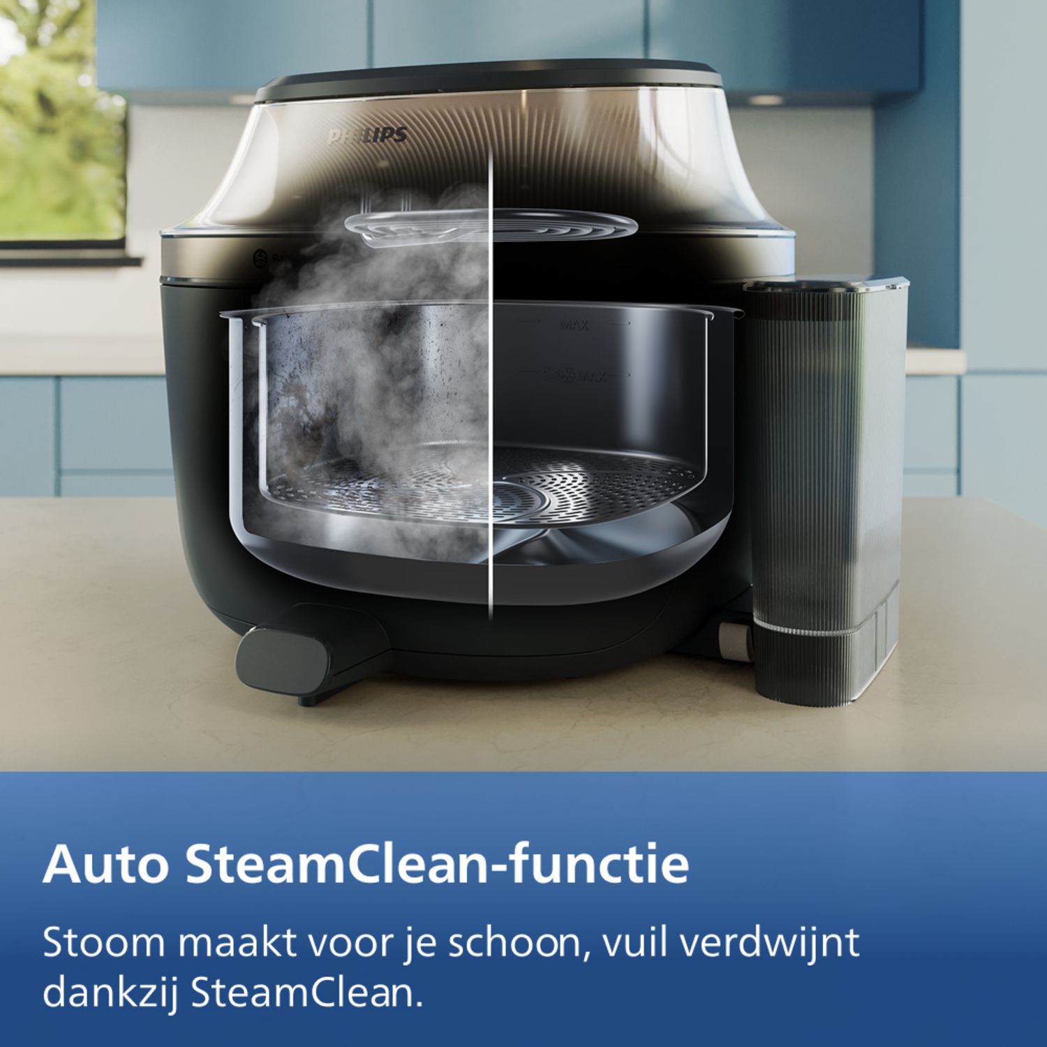 Dankzij de automatische SteamClean-functie is vet in de mand eenvoudig te verwijderen.