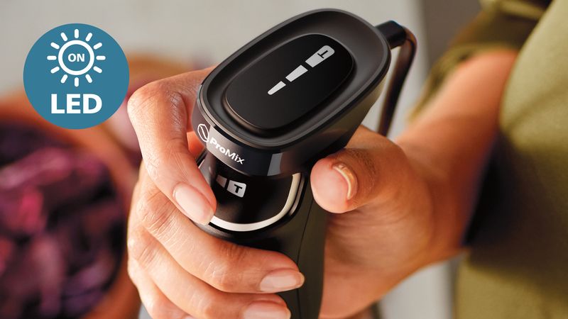 Pas uw snelheid aan tijdens het mengen voor een betere controle dankzij de intuïtieve snelheidsschakelaar. Begin langzaam om spatten te voorkomen en druk vervolgens geleidelijk harder om het vermogen geleidelijk te verhogen.