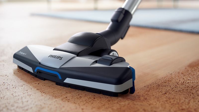 Het TriActive+-mondstuk voert 3 reinigingshandelingen in één keer uit. Aan de voorzijde zit een grotere opening om grotere vuildeeltjes op te zuigen, terwijl de speciaal ontworpen zoolplaat stof diep uit tapijt verwijdert. Luchtkanalen en borstels aan beide zijden van het mondstuk nemen stof en vuil op langs muren en meubels.