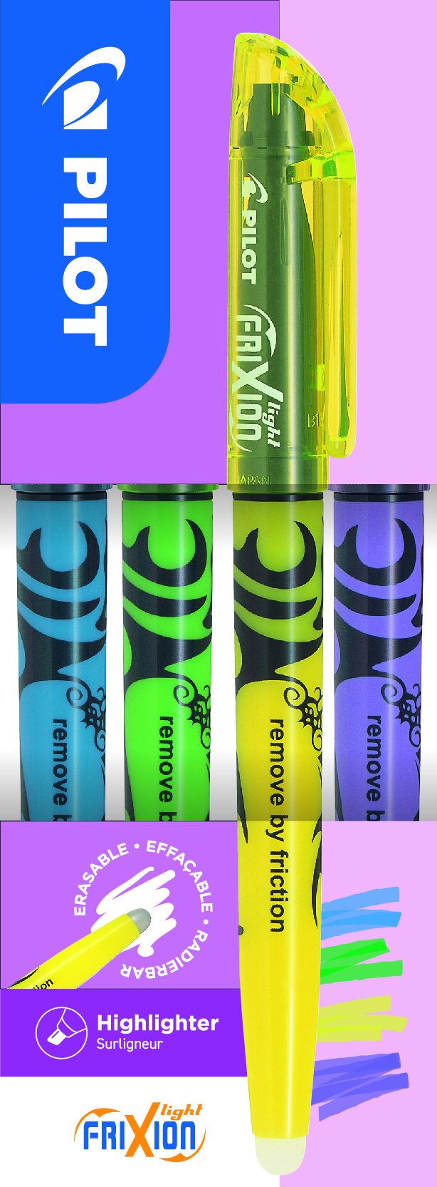 Pilot Frixion Light Set 4 Kleuren Blauw-Groen-Geel-Violet Uitwisbaar