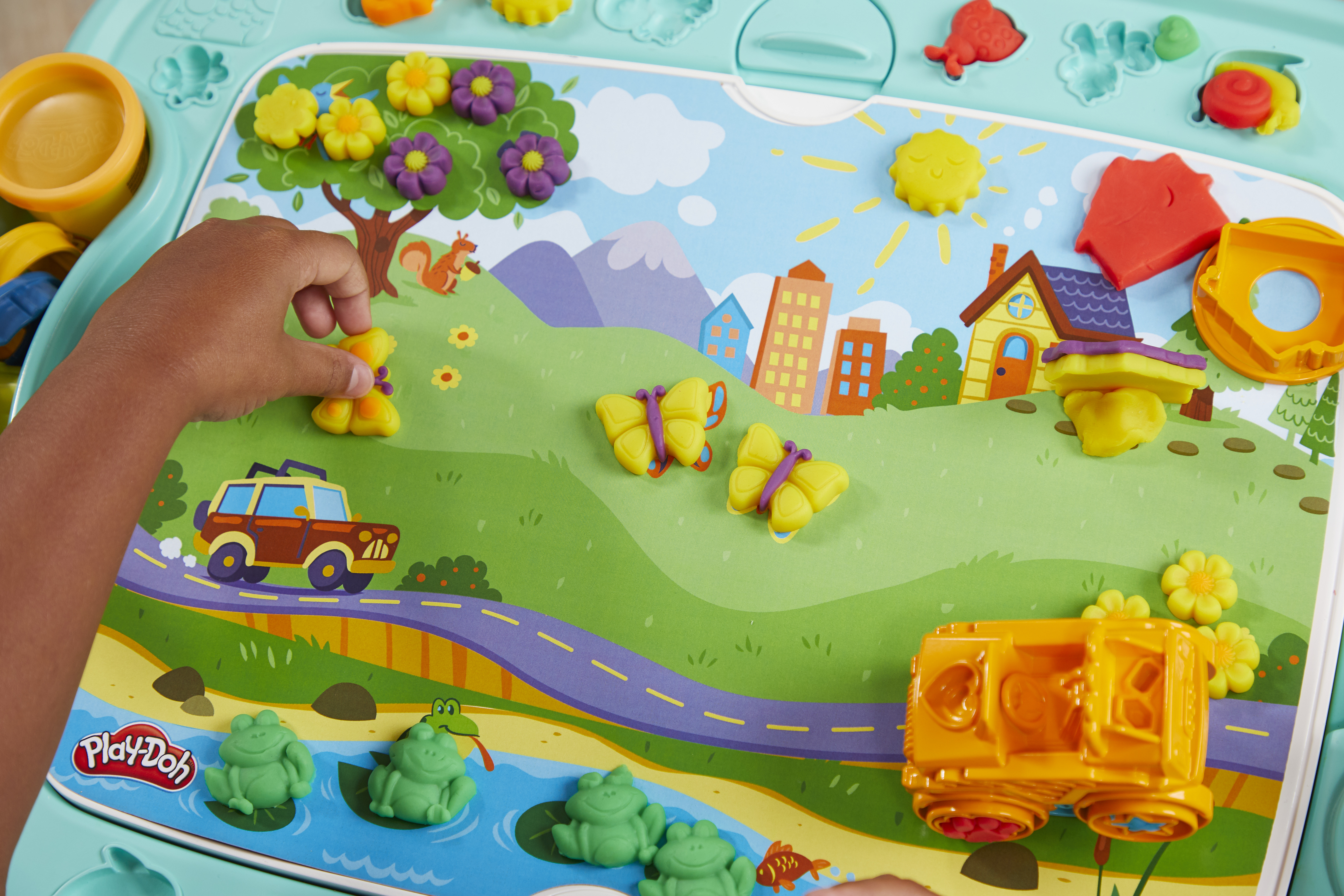 - DRAAI OM VOOR MEER CREATIEF PLEZIER: op de vlakke kant van de tafel kunnen kinderen 2-dimensionaal spelen met de speelmat en Play-Doh-gereedschap. Draai om naar de 3D-kant voor avonturen die nog meer tot de verbeelding spreken