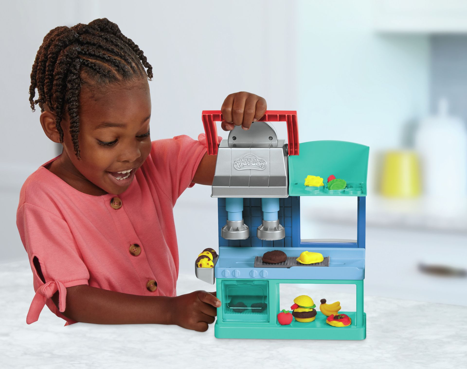 Met de Play-Doh Kitchen Creations Busy Chef's Restaurant-speelset hebben kinderen het gevoel dat ze hun eigen restaurant runnen: ze maken, veranderen en delen Play-Doh-gerechten met ingebeelde klanten! Kinderen kunnen de stempels eenvoudig bevestigen en pizza, hamburgers, pasta of kip namaken. Duw op de hendel om 2 namaakgerechten tegelijkertijd te stempelen! Als ze de hendel loslaten, verschuift de bakplaat naar het bereidingsstation! Maak toppings voor burgers, fantastische friet, gekke koekjes en meer namaakvoedsel met de halve vormpjes aan beide kanten van deze kinderspeelset.