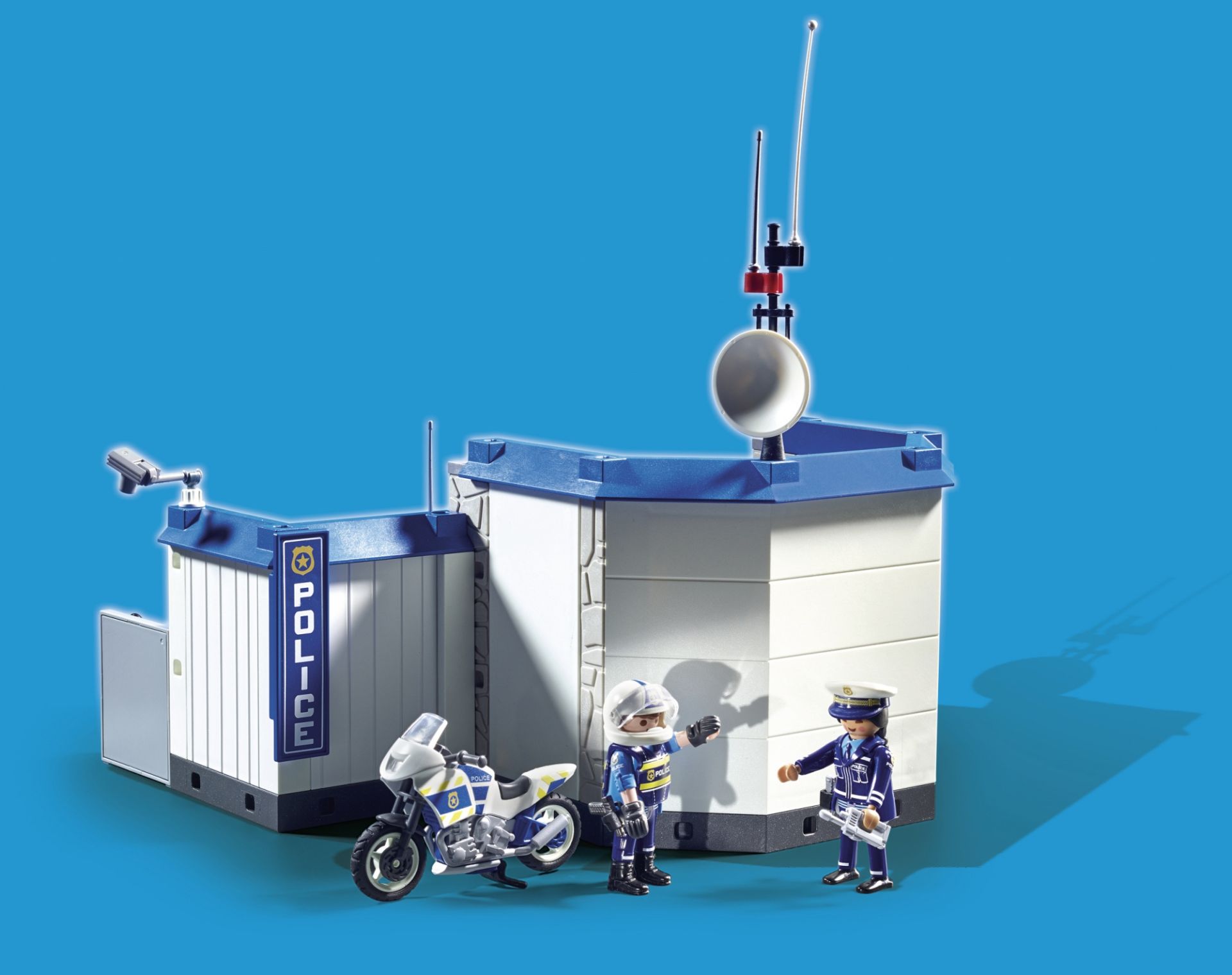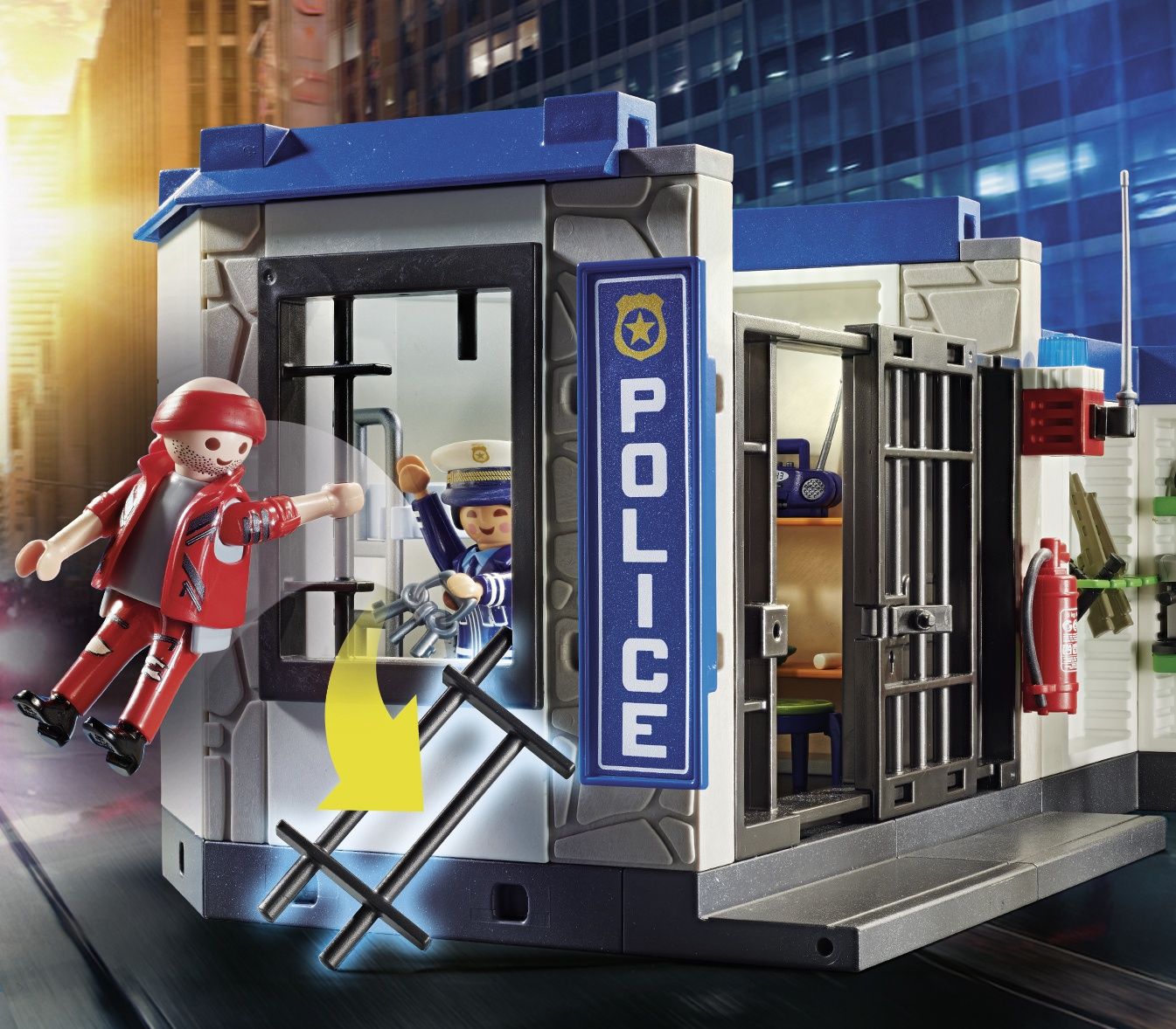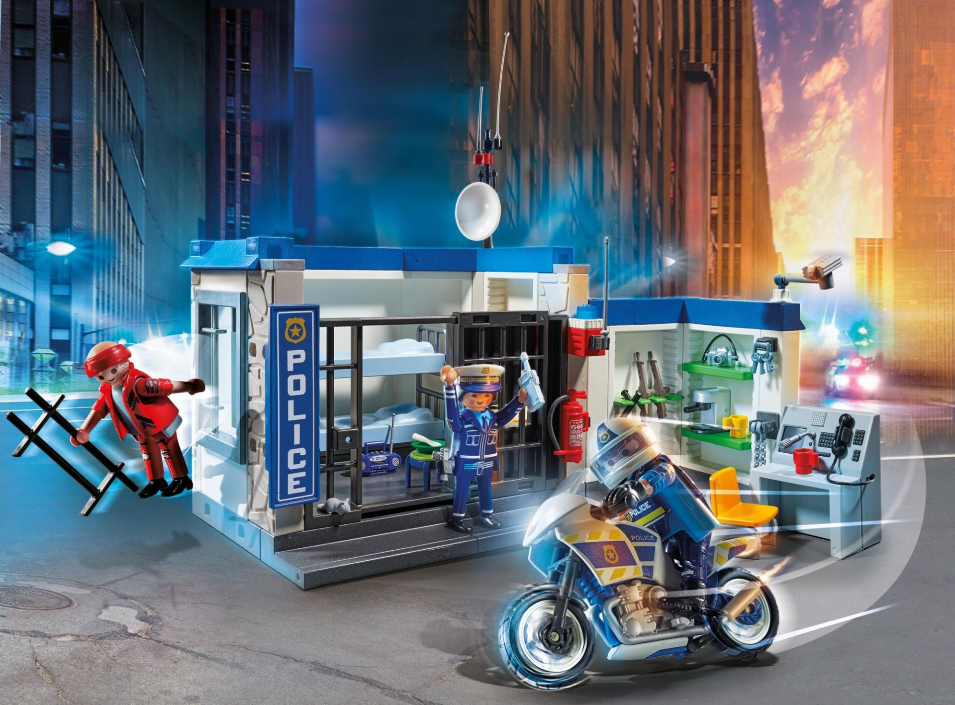 De speelset bevat drie PLAYMOBIL-figuren, een politiebureau met gevangeniscel en werkplek, planken en een espressomachine, een politiemotor en vele andere extra's voor spannende politie-actie-avonturen.