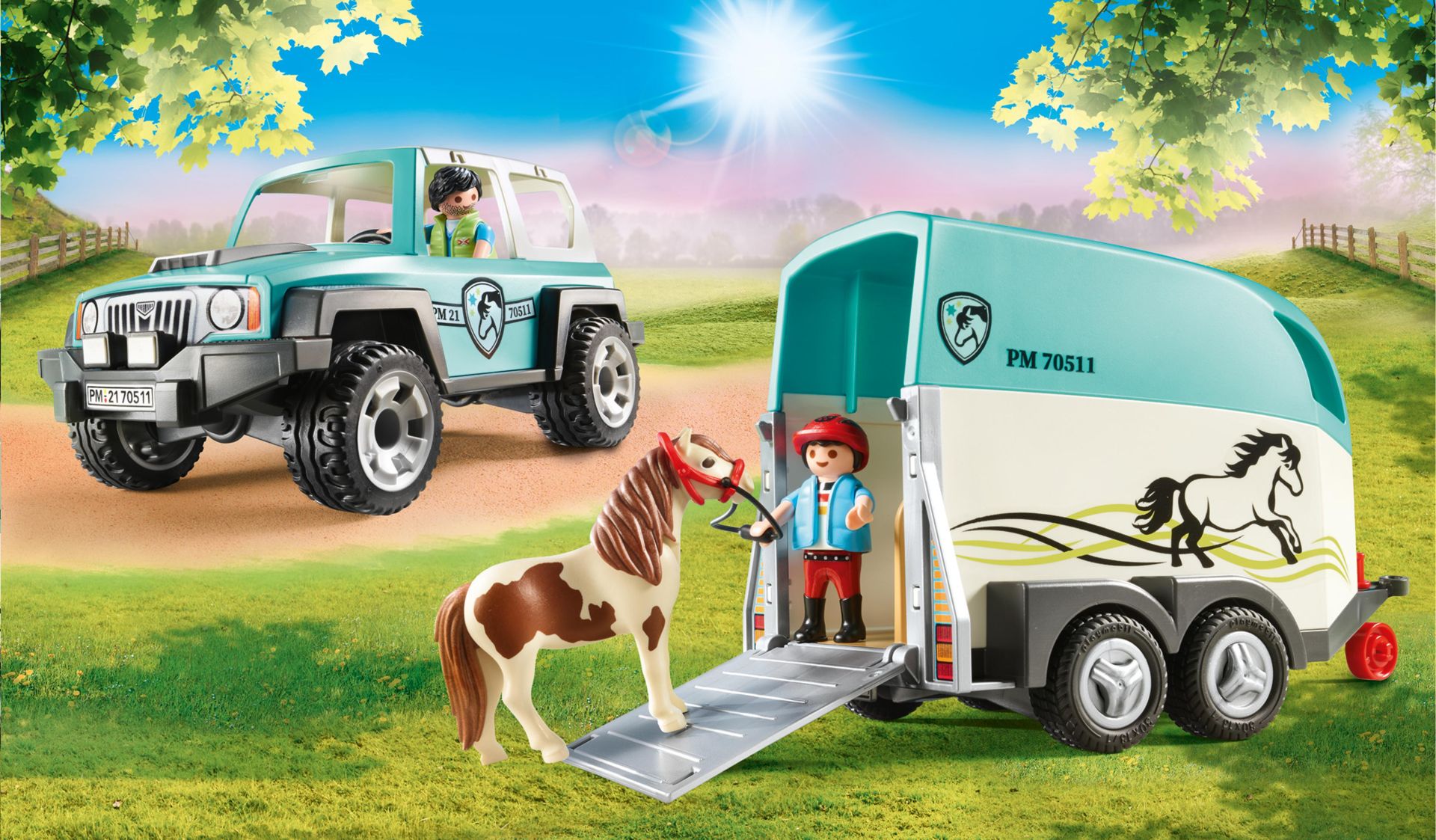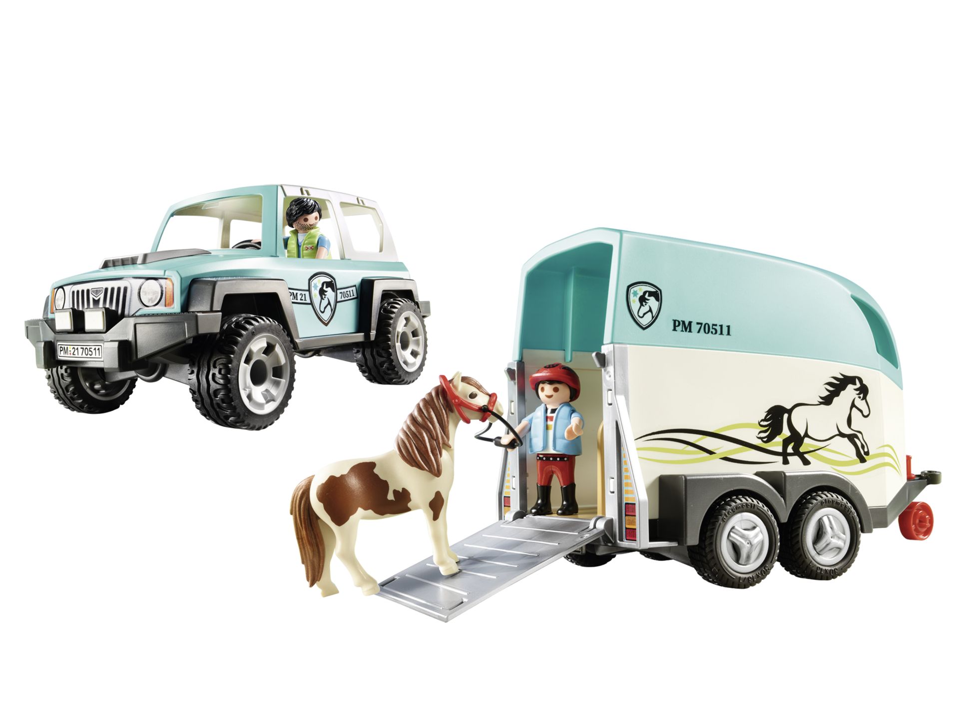 De speelset bevat een auto met een ponyaanhanger, twee PLAYMOBIL figuren, een pony en andere extra's. Het dak van de auto en aanhanger kan worden verwijderd.