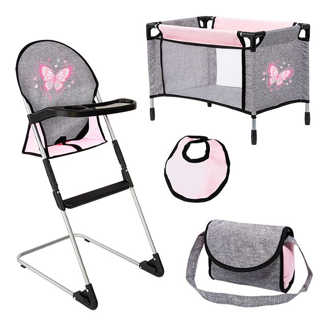 Poppenreisset 4-delig met reisbed en hoge stoel, met eenhoorndecor
