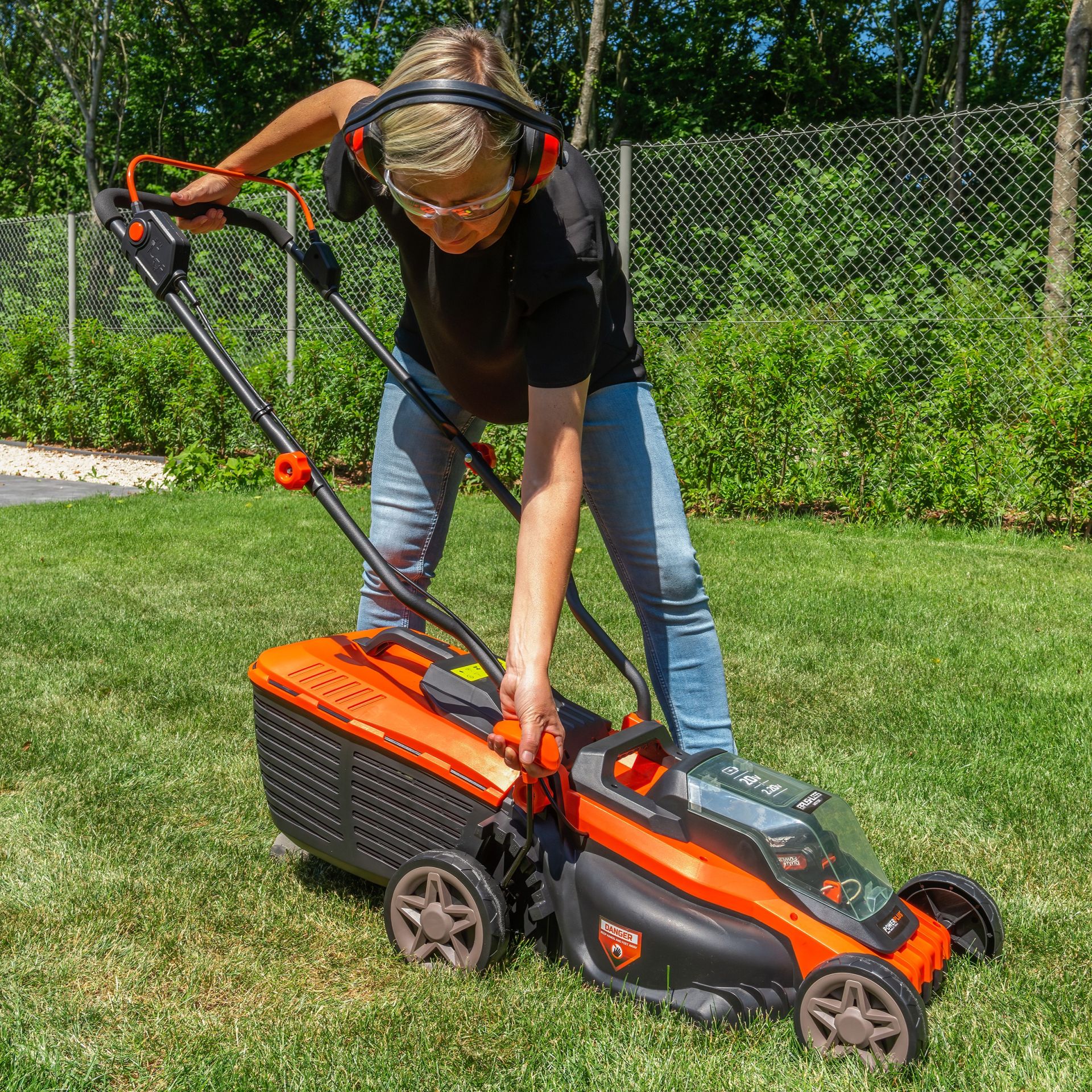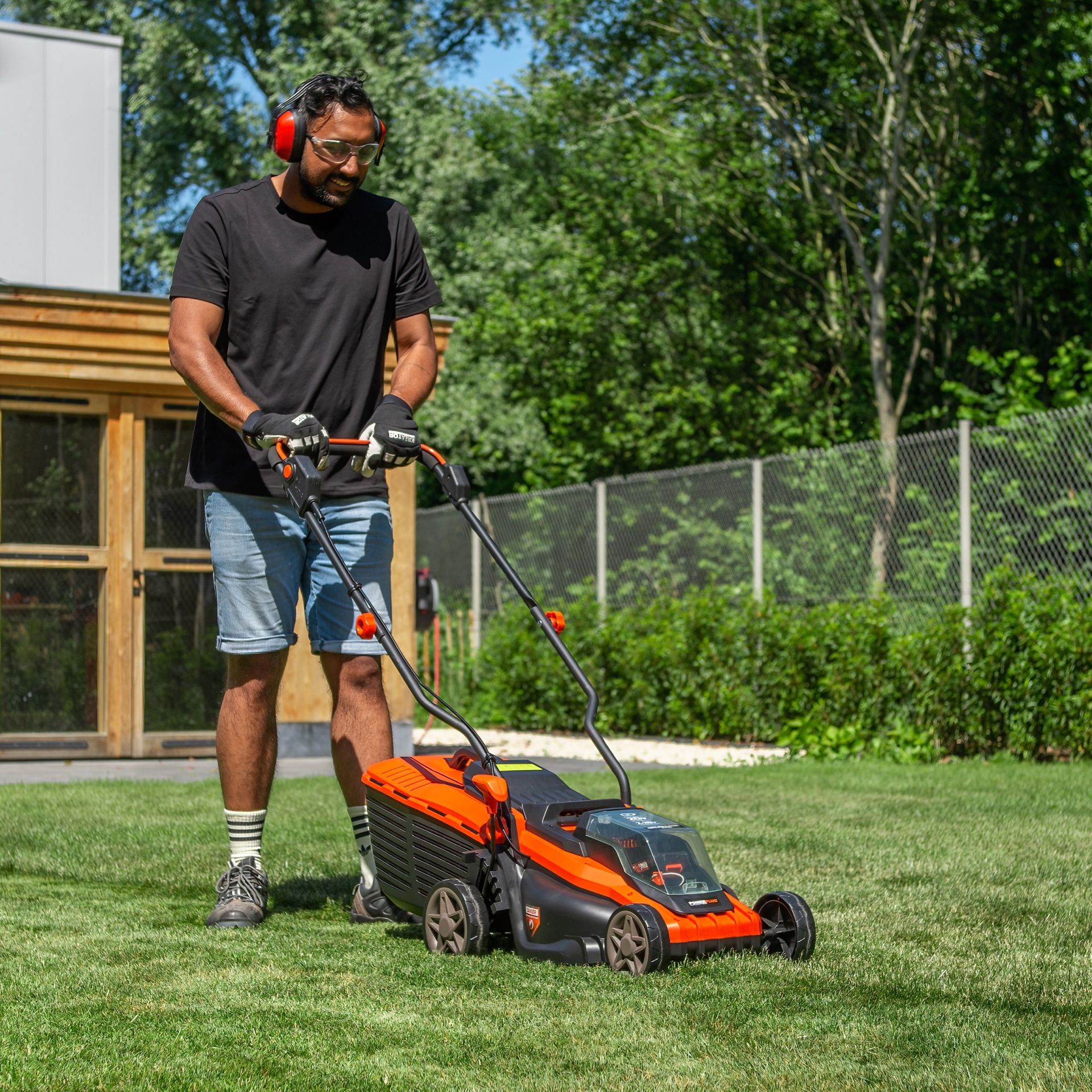De grasmachine is ideaal voor kleine stadstuinen tot 200 m² en je kan er ook je grasranden mee onder handen nemen. Hij beschikt over 5 verschillende maaihoogtes tussen 25 mm en 65 mm.