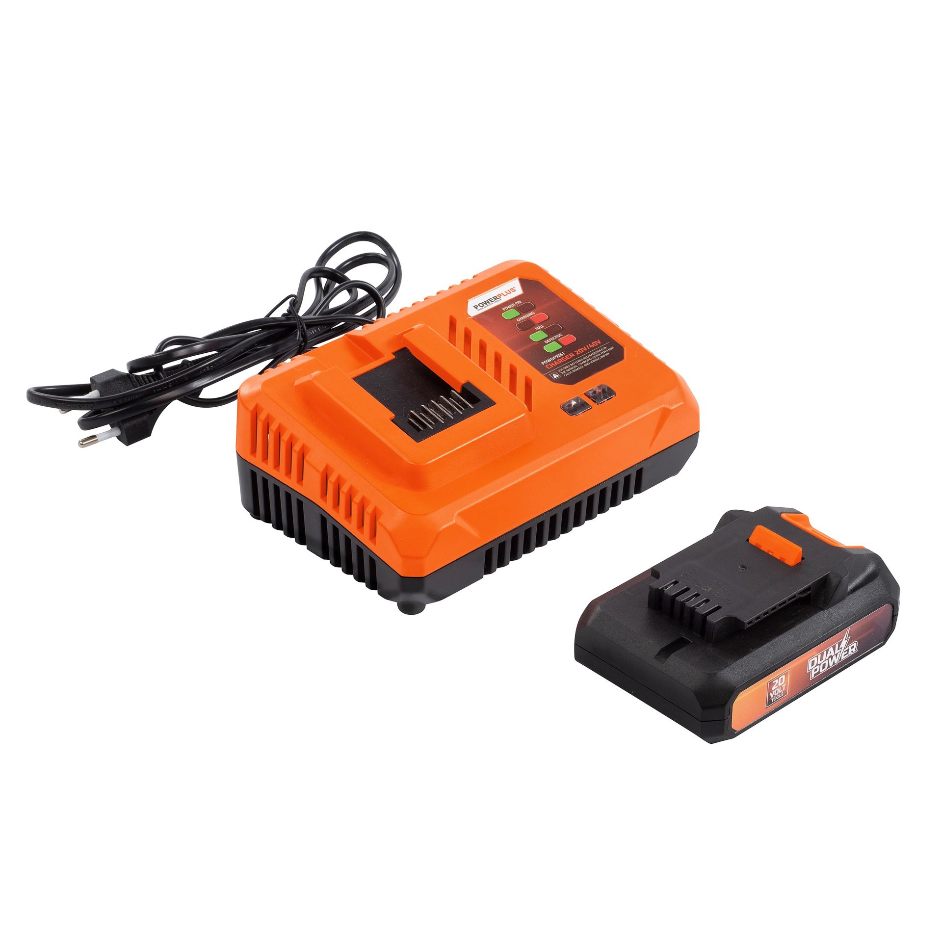 Om de set compleet te maken, bevat ze ook nog een 20 V-accu en de bijhorende lader. De 20 V-batterij past op alle 20V-toestellen uit het Dual Power assortiment. Tenslotte is er nog de lader, die compatibel is met zowel de 20 V als 2x20 V Dual Power batterijen.