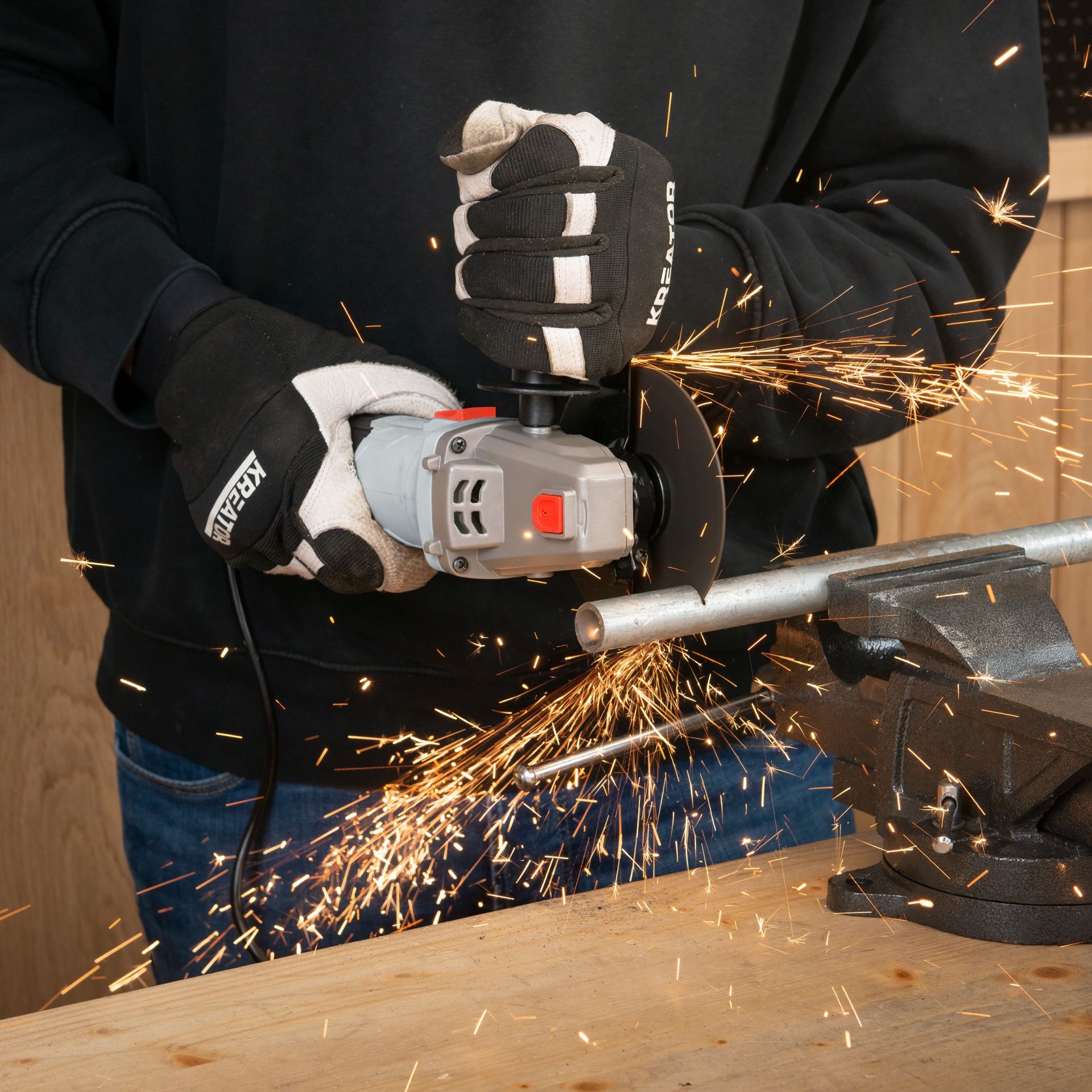 * Werk je met een haakse slijper, dan is het aangeraden de juiste soorten bescherming te dragen. Welke bescherming je zeker nodig hebt, kan je steeds terug vinden op het label op het toestel, en uiteraard in de gebruikshandleiding. Ons Kreator-assortiment biedt tal van veiligheidsartikelen zoals gehoorbescherming, mondmaskers, veiligheidsbrillen en meer.