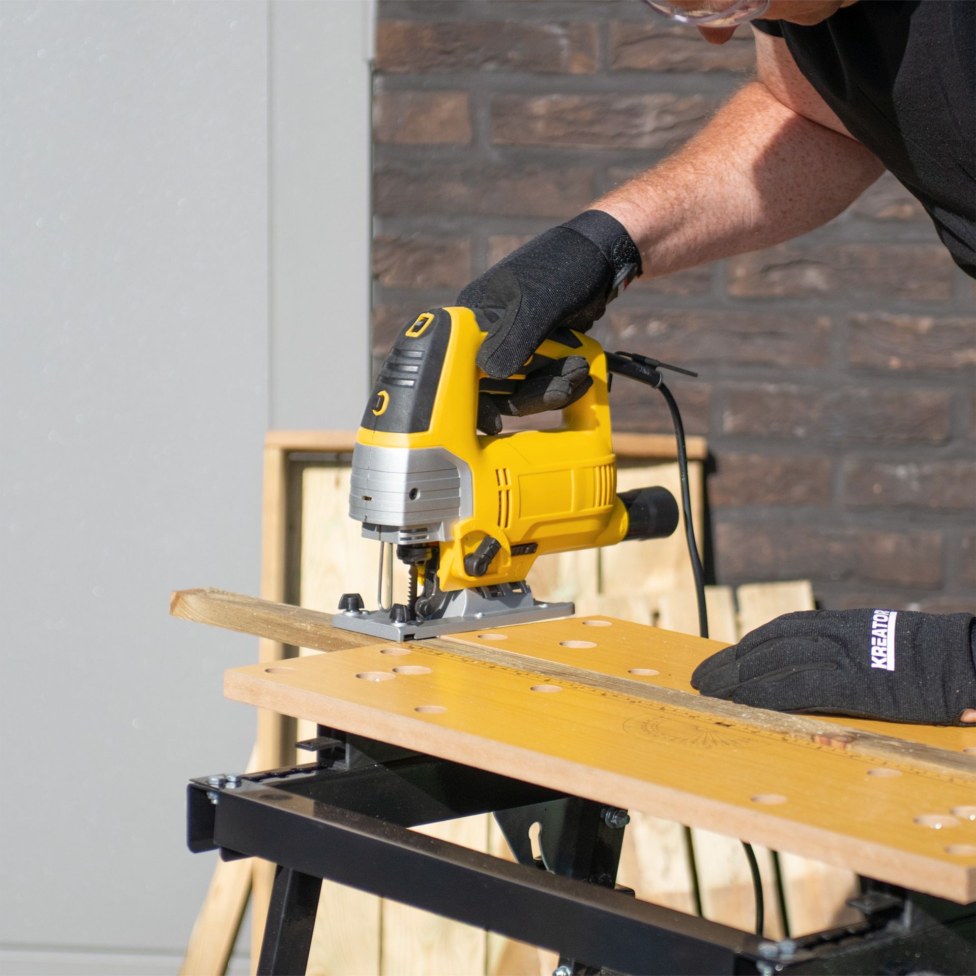 Deze decoupeerzaag kan je gebruiken om onregelmatige vormen uit te zagen, maar ook om recht of in verstek te zagen. Hij is namelijk voorzien van een stevige zijgeleider, een ingebouwde laser én een verstelbare voet. In staal zaag je tot 8 mm, tot 80 mm in plastic en in hout tot wel 80 mm diep.