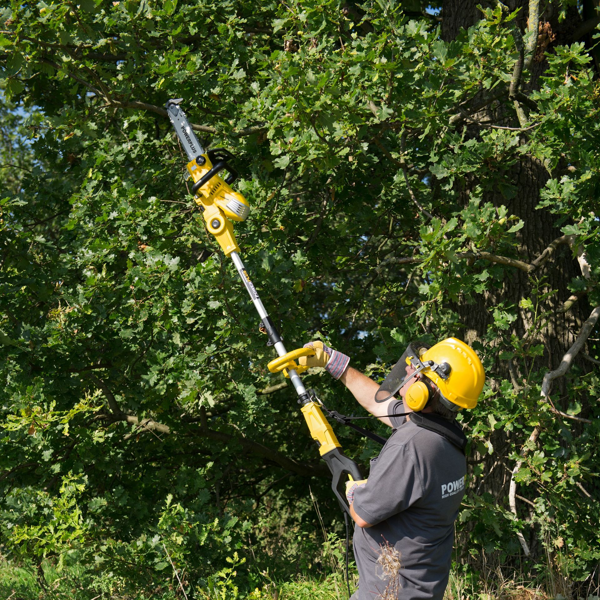 Deze kettingzaag is geschikt voor zaagklussen die met een normale kettingzaag moeilijk zijn uit te voeren vanwege hoge takken en of moeilijk bereikbare plekken. Door het telescopische verlengstuk te verwijderen, transformeer je het toestel tot een gewone kettingzaag.