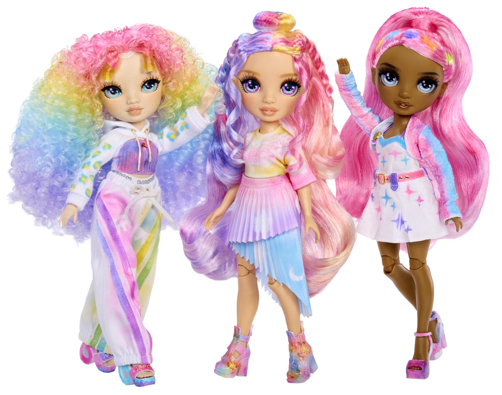 VERZAMEL ZE ALLEMAAL: 3 poppen met eigen mode, kapsels en kleur ogen (groen, grijs en paars). De creatieve mogelijkheden zijn eindeloos.