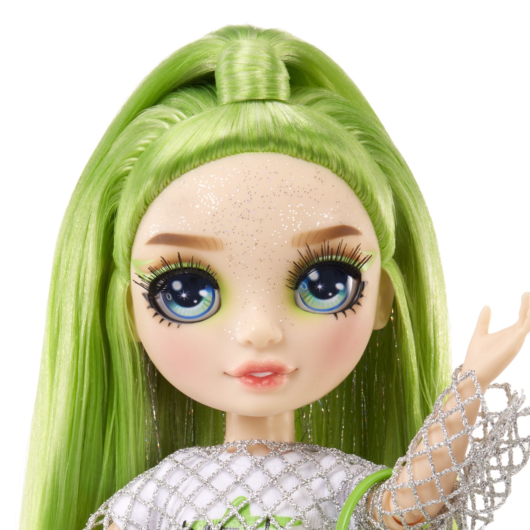 GLINSTERT IN HET GROEN: Jade is van top tot teen gekleed in het GROEN, met veel glans en glinsteringen. Haar mode is voorzien van schitterende details en ze heeft prachtig lang, deels opgestoken, groen haar, lange wimpers en glazen ogen. Haar gezicht fonkelt met magische glitters