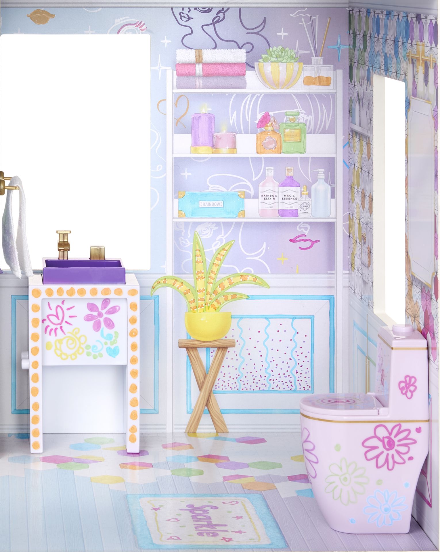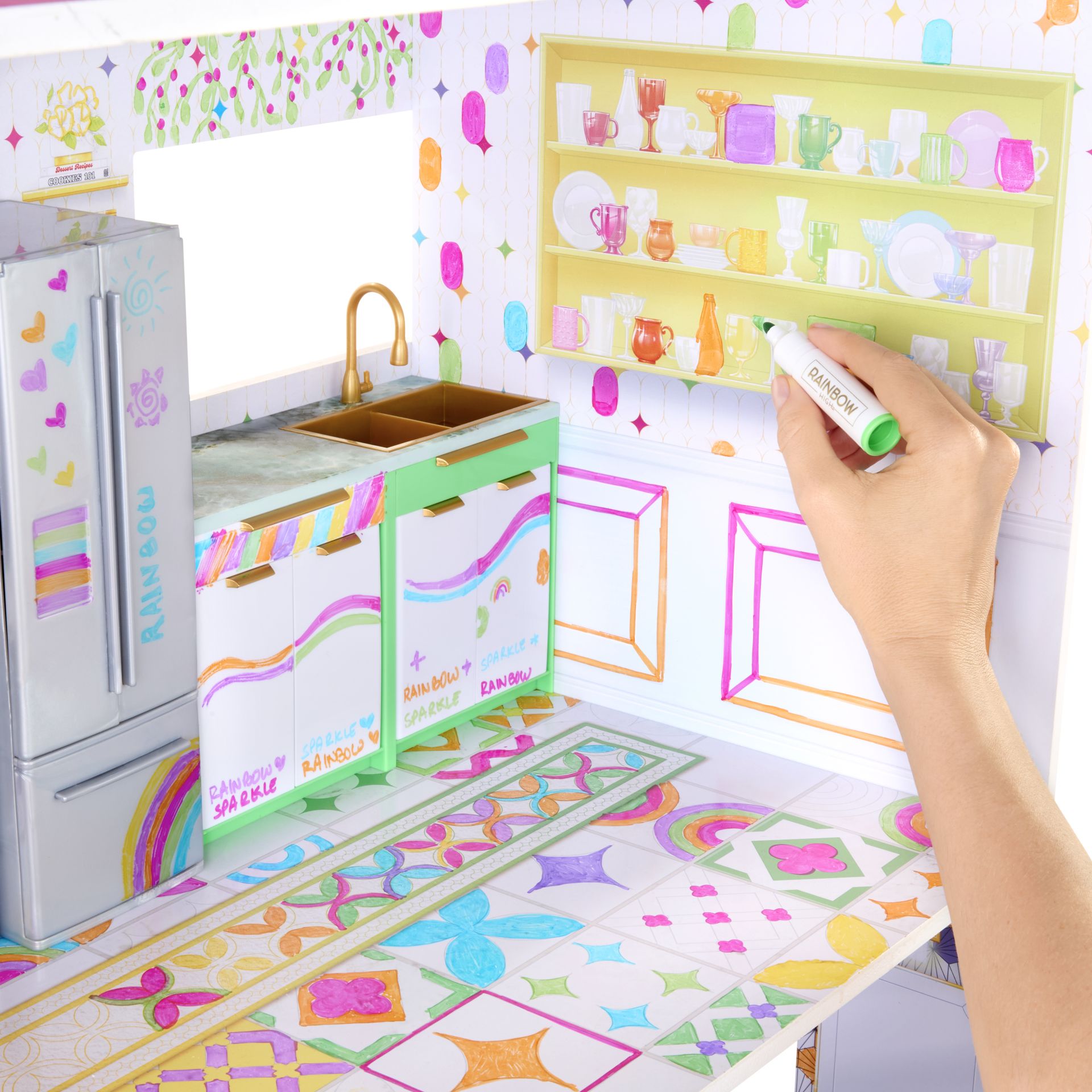 "Geef je creativiteit vrij spel met het gloednieuwe Rainbow High Color & Play-huis! Voor het eerst kun je je wanden en vloeren aanpassen zoals je wilt en je eigen stijl kiezen. Pak gewoon de uitwisbare markers en begin te ontwerpen! Wil je een nieuwe look? Veeg je creatie uit en kleur opnieuw: eindeloos veel creativiteit, eindeloos veel plezier!