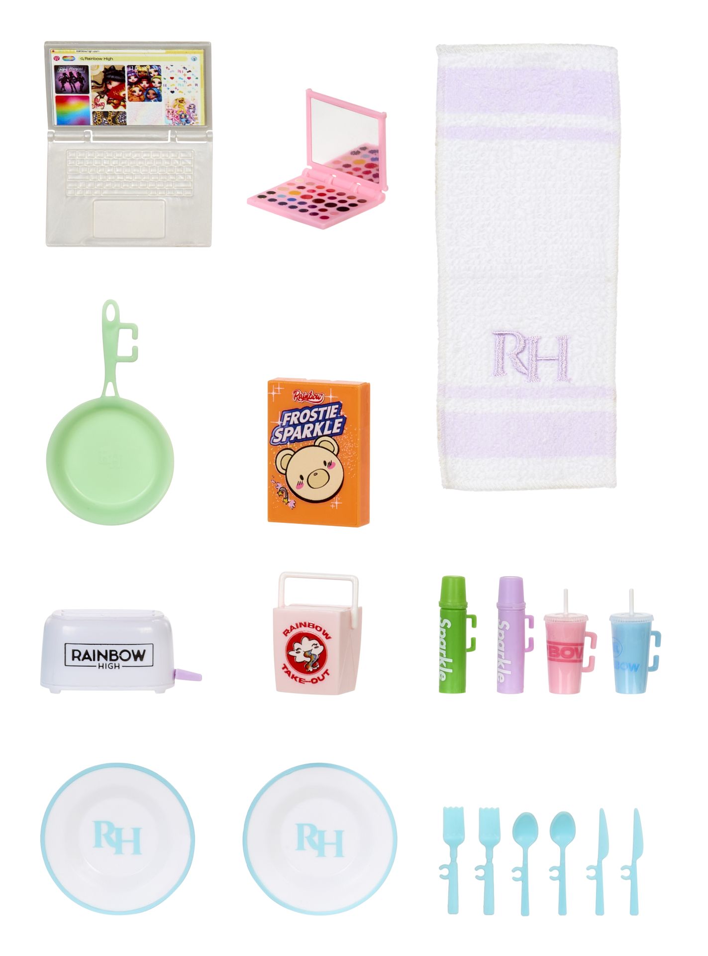 ACCESSOIRES OM VERHALEN TE VERTELLEN: het huis is inclusief laptop, make-up, keukenspullen, borden, kopjes, eten, broodrooster en kledinghangers.