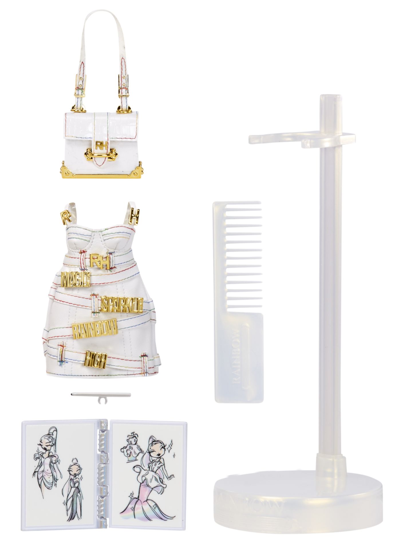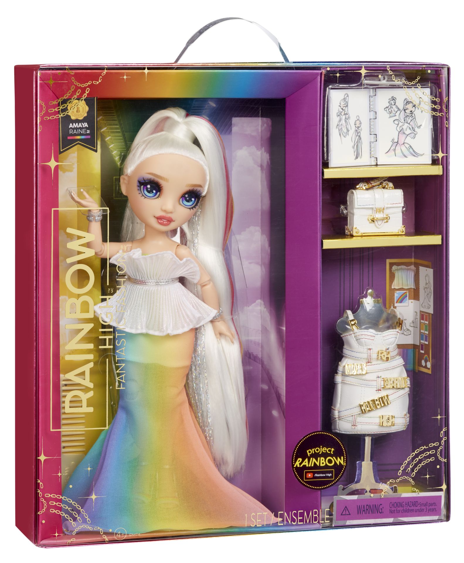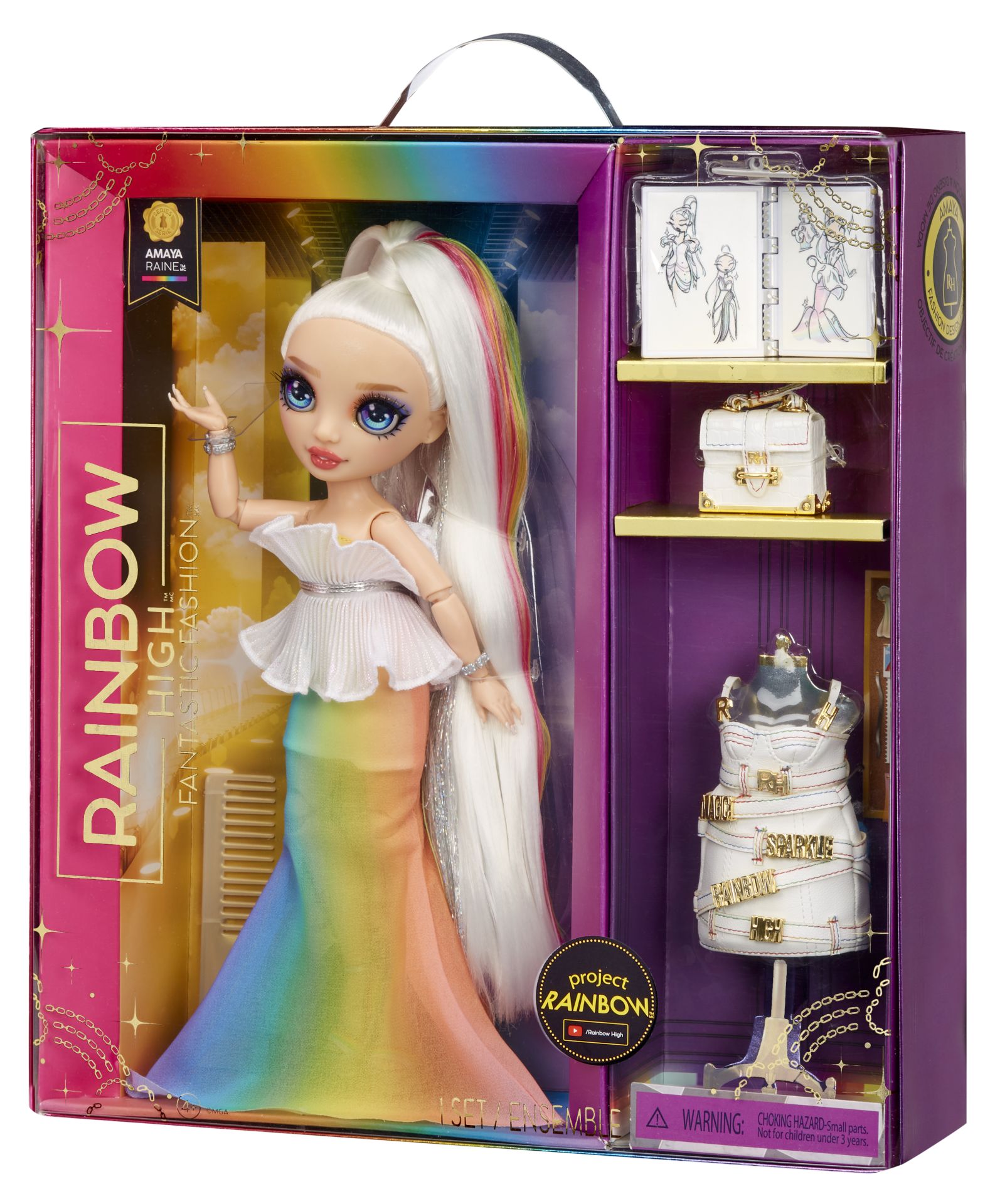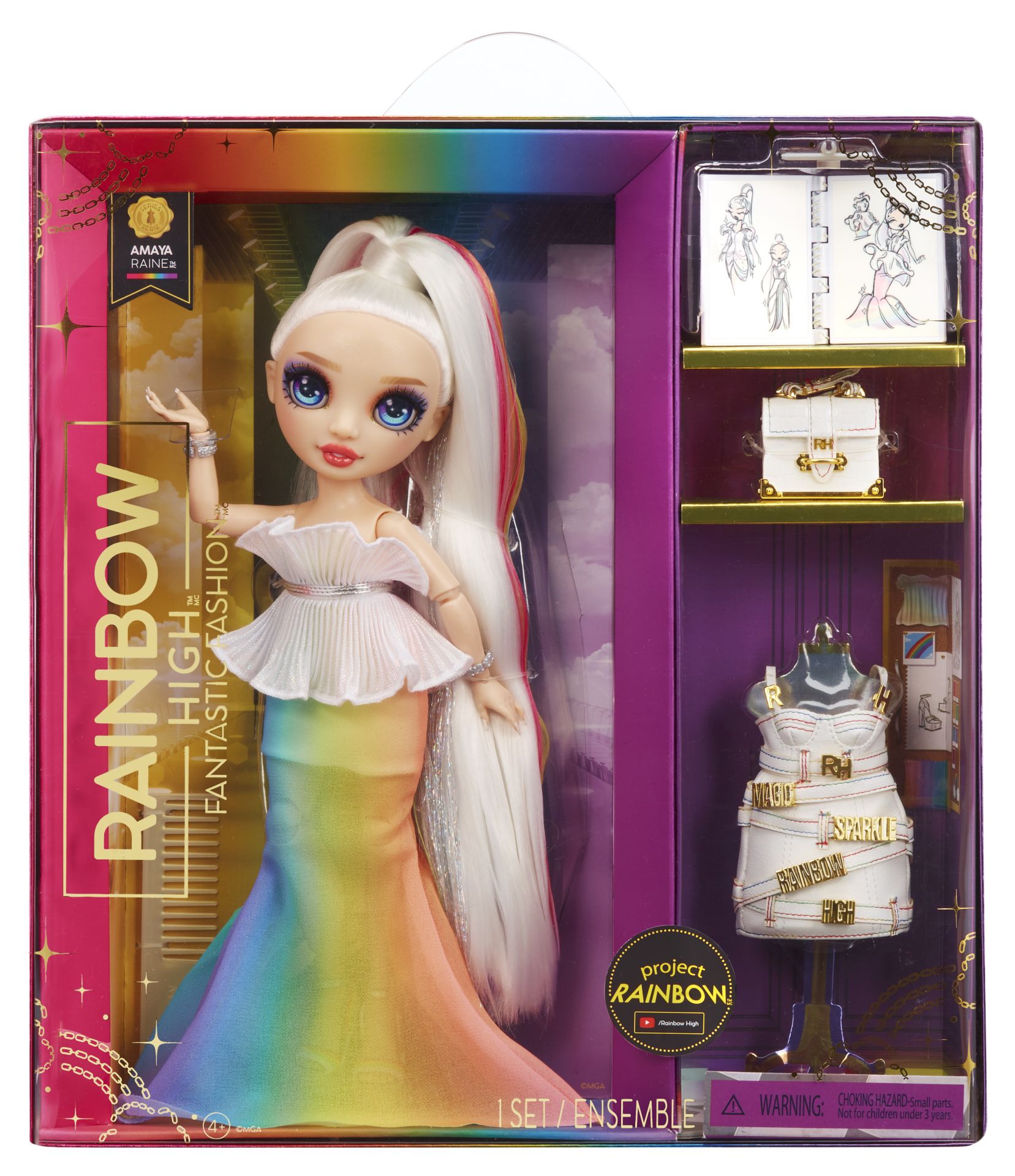 2 MIX EN MATCH-OUTFITS: Amaya draagt haar schitterende, glinsterende regenboogjurk en hakken in haar kenmerkende regenboogkleuren. Haar tweede outfit bestaat uit een schattige witte jurk met kleurrijke draden en een bijpassend koffertasje. Kleed haar in de looks, mix en match de mode, of mix en match met de andere Rainbow High™ Fantastic Fashion™-speelsets zoals jij wilt
