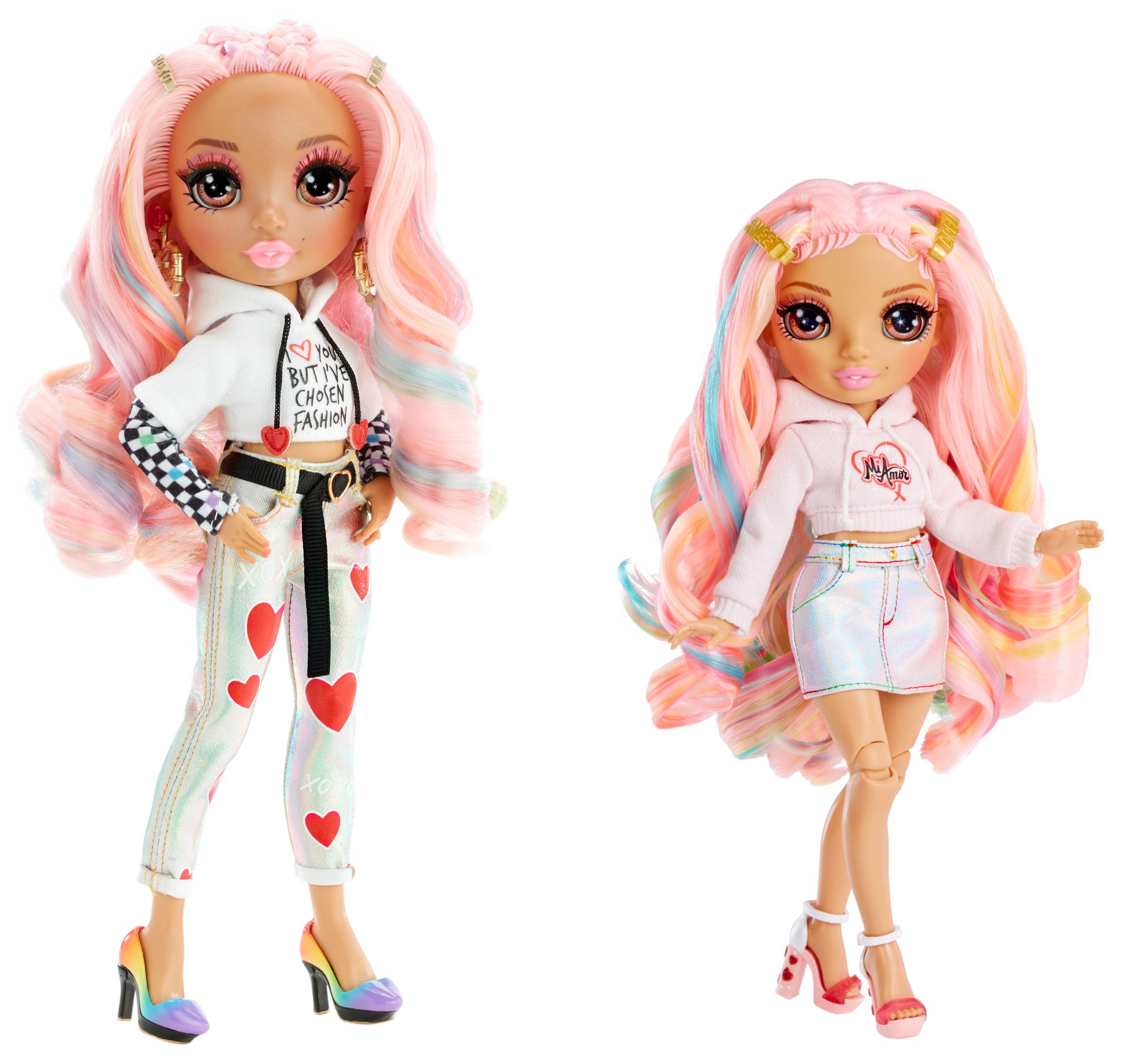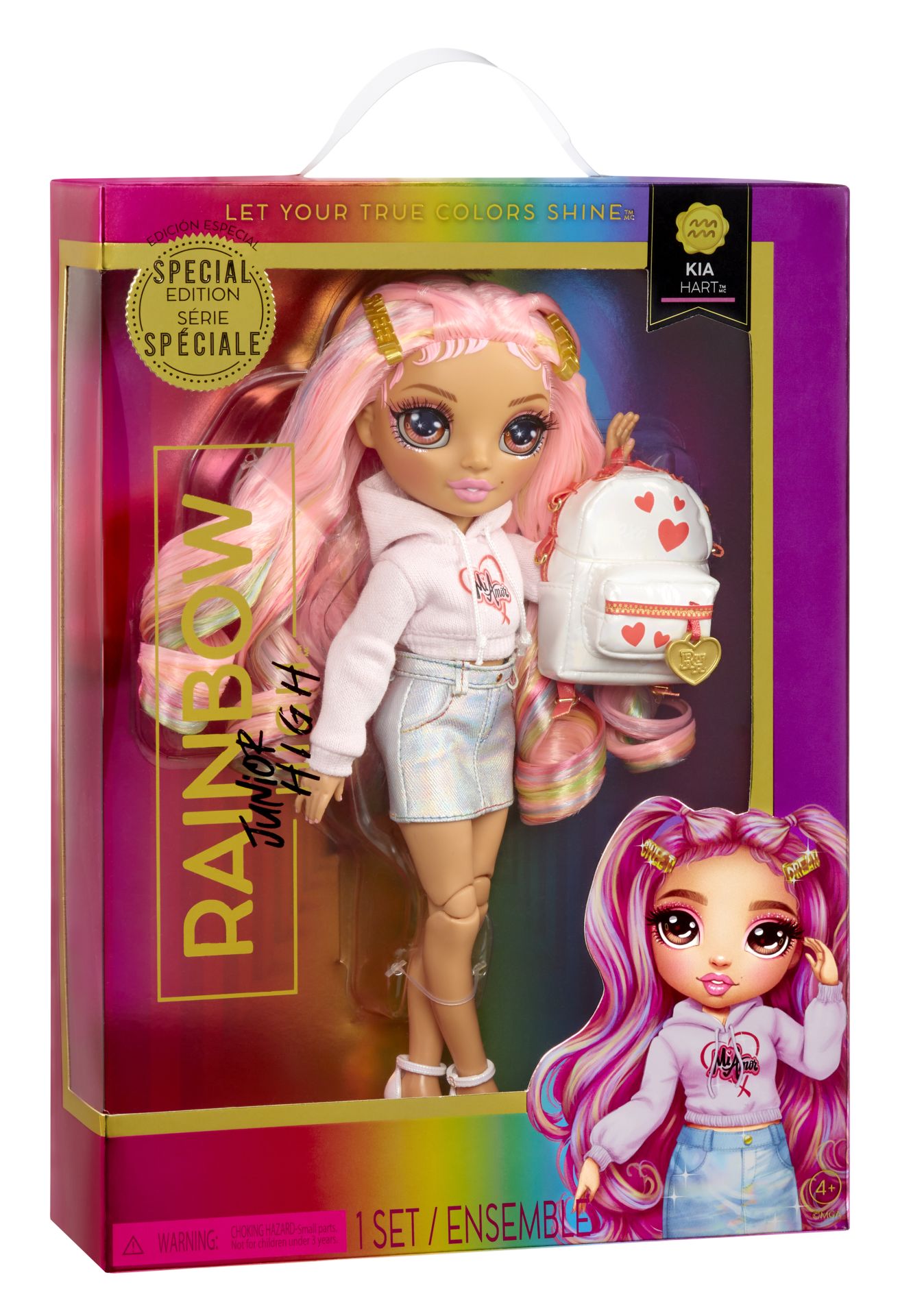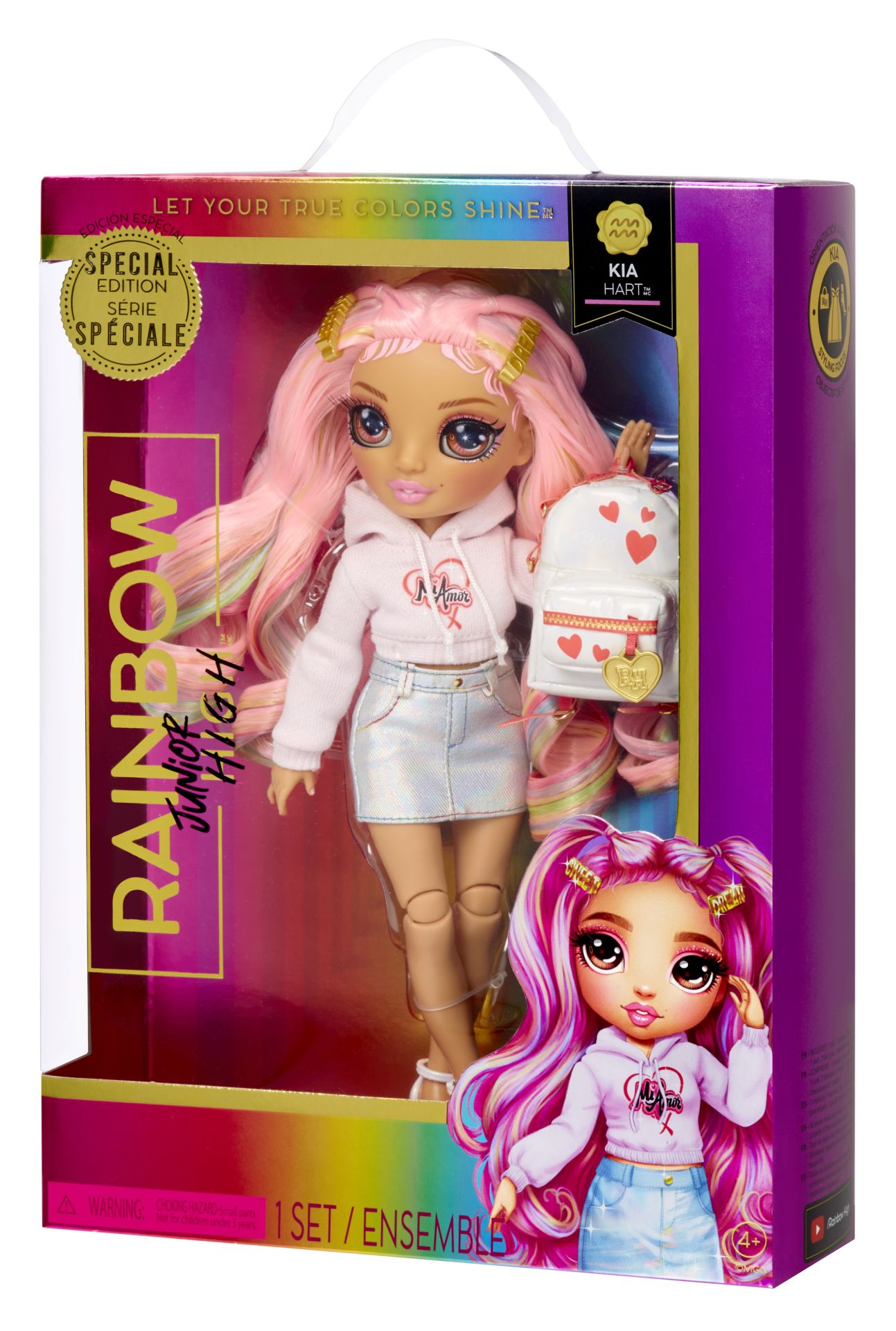 SCHITTERENDE KENMERKEN: Kia Hart™ is gekleed in zachtroze met hartjes. Ze heeft een supermooi, jonger gezichtje, mode met prachtige details, schitterend lang, steil, roze met paars haar, lange wimpers en glazen ogen. Verzamel en speel met al deze leuke en mooie Rainbow Junior High™-modepoppen