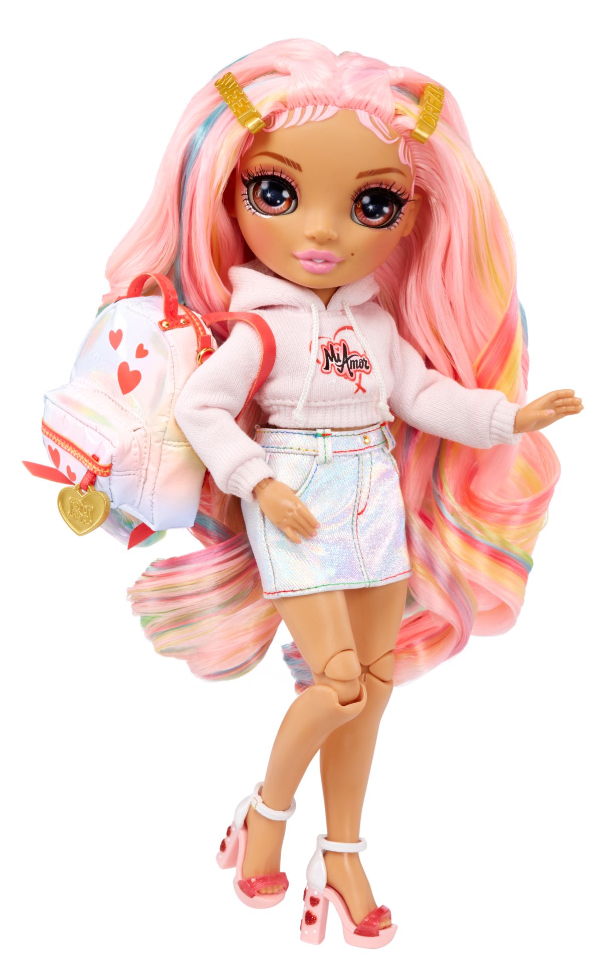 JR HIGH-MODE: Kia is onze lieve koppelaar en draagt een schattige roze sweater met de tekst ‘Mi Amore’. Ze draagt ook een holografische zilverfolie, geprint op een denim rok en roze hakken. En uiteraard heeft ze een rugzak met hartjes