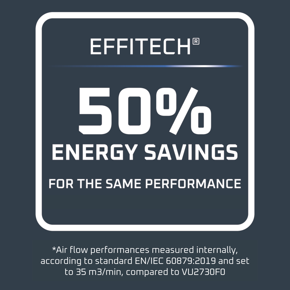 slechts 32 dB(A) op min. snelheid levert de Effitech motor een intense