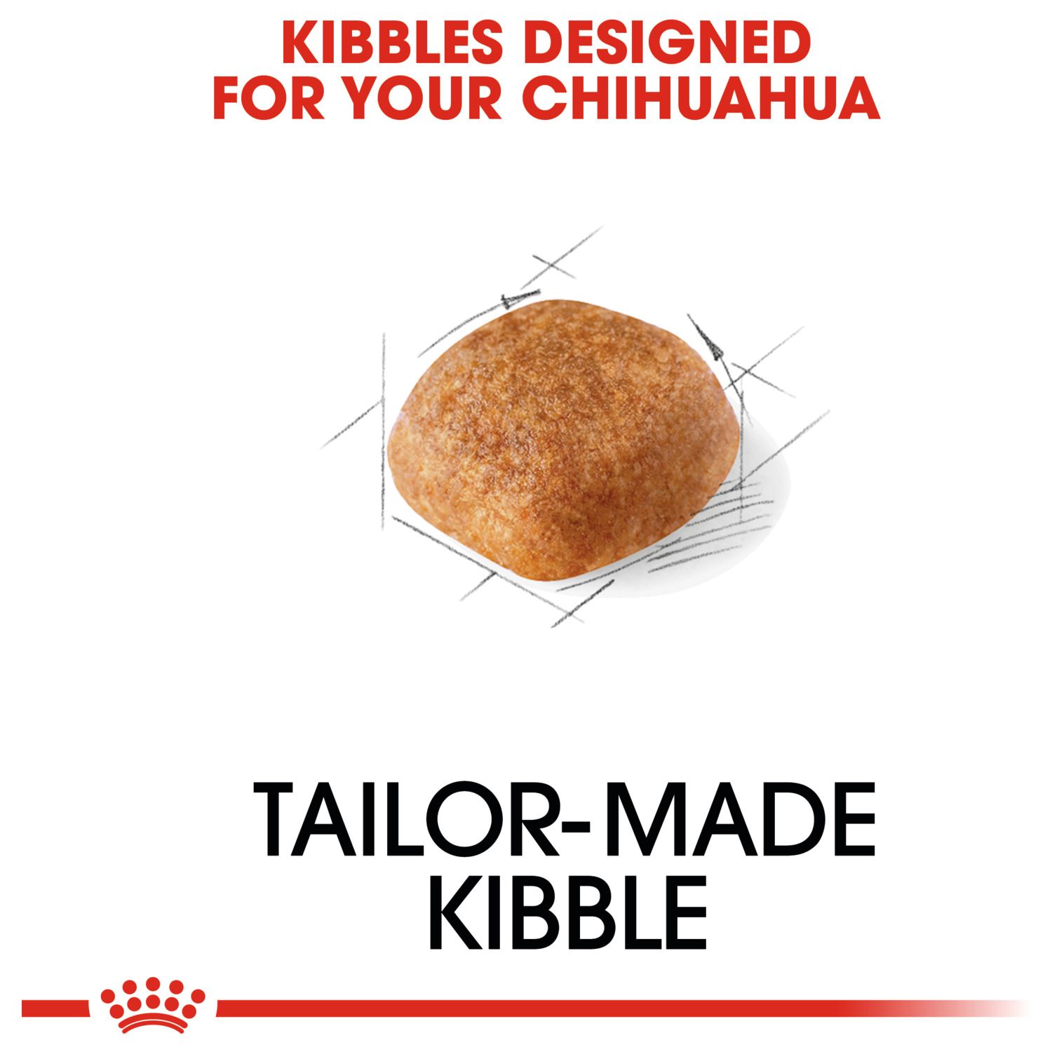 Chihuahua adult komt tegemoet aan de eetlust van de Chihuahua dankzij de combinatie van drie factoren: de aangepaste grootte en vorm van de brokjes, de exclusieve samenstelling en de selectieve smaak.